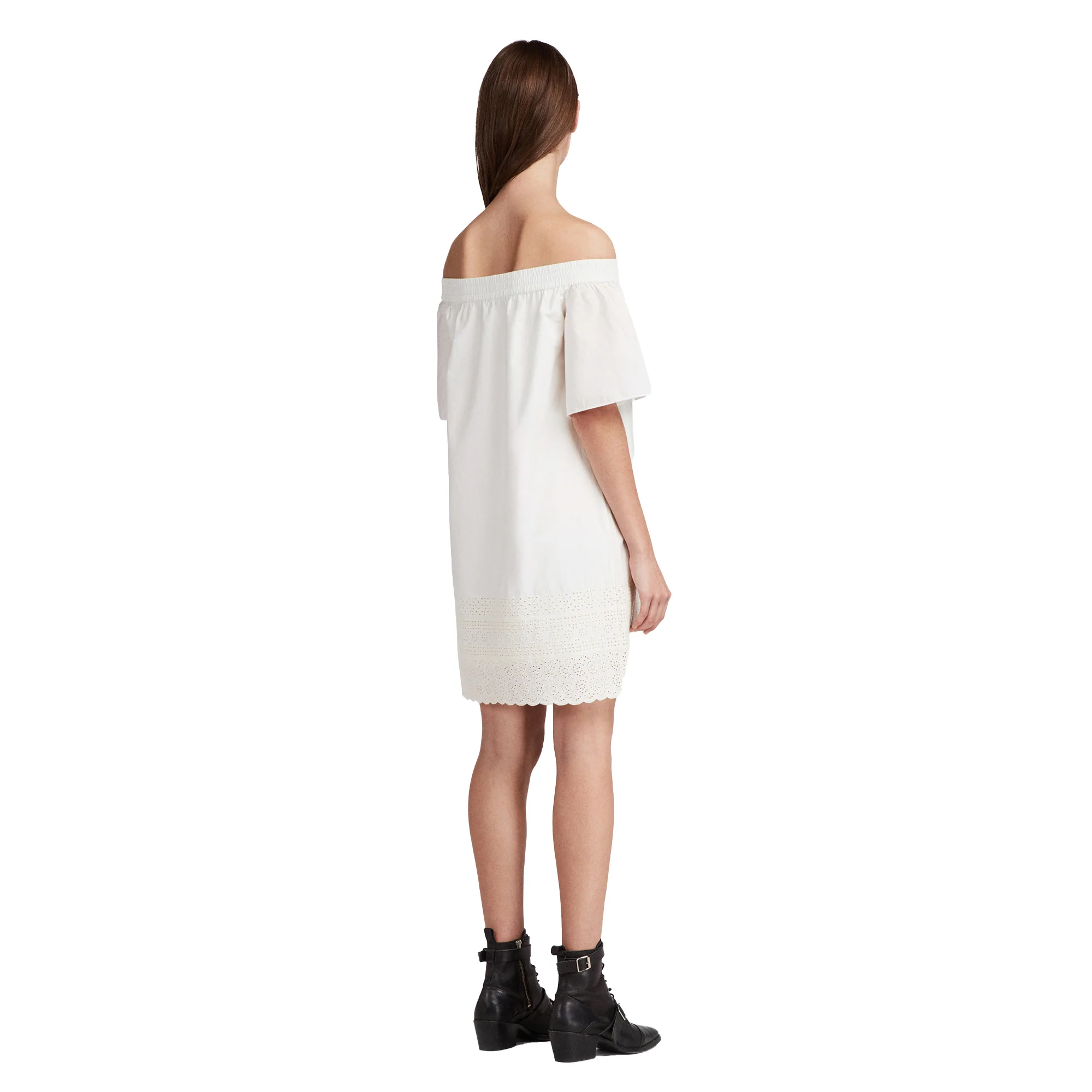 VESTIDO LIVIA TRIXI, MARCA ALLSAINTS. VESTIDO CORTO CON HOMBROS DESCUBIERTOS, MANGAS CORTAS ACAMPANADAS, PANEL DE BRODERIE ANGLAISE EN EL DOBLADILLO. 100% ALGODÓN. LAVAR A MÁQUINA AL REVÉS.