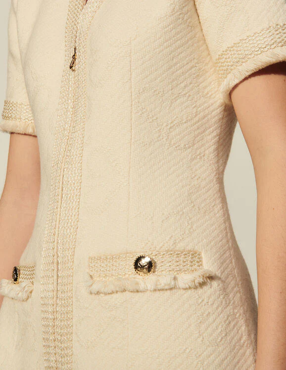 Vestido De Mujer Sandro • Vestido Corto De Tweed De Jacquard Doble S • Escote En V Bordado Con Un Pasamano • Manga Corta Con Acabado De Pasamano Y Flecos • Bolsillos De Ojal En La Parte Delantera Con Acabado De Pasamano Y Flecos • Cierre De Cremallera En El Centro De La Parte Delantera • Largo Hasta La Mitad Del Muslo • La Modelo Lleva La Talla 36Référence : Sfpro01443 Composición Tejido Principal: 56% Lana, 22% Acrílico, 12% Poliamida, 8% Algodón, 2% Poliéster Forro: 100% Poliéster Forro Bolsillos: 100% Algodón