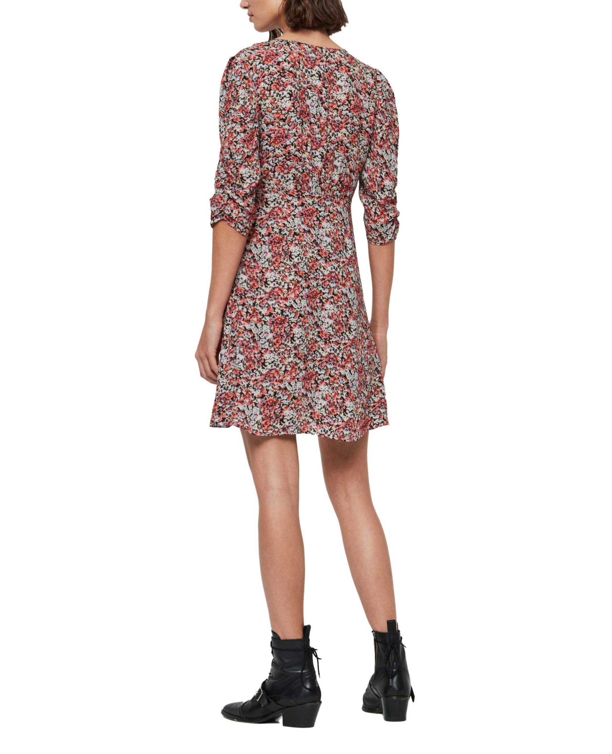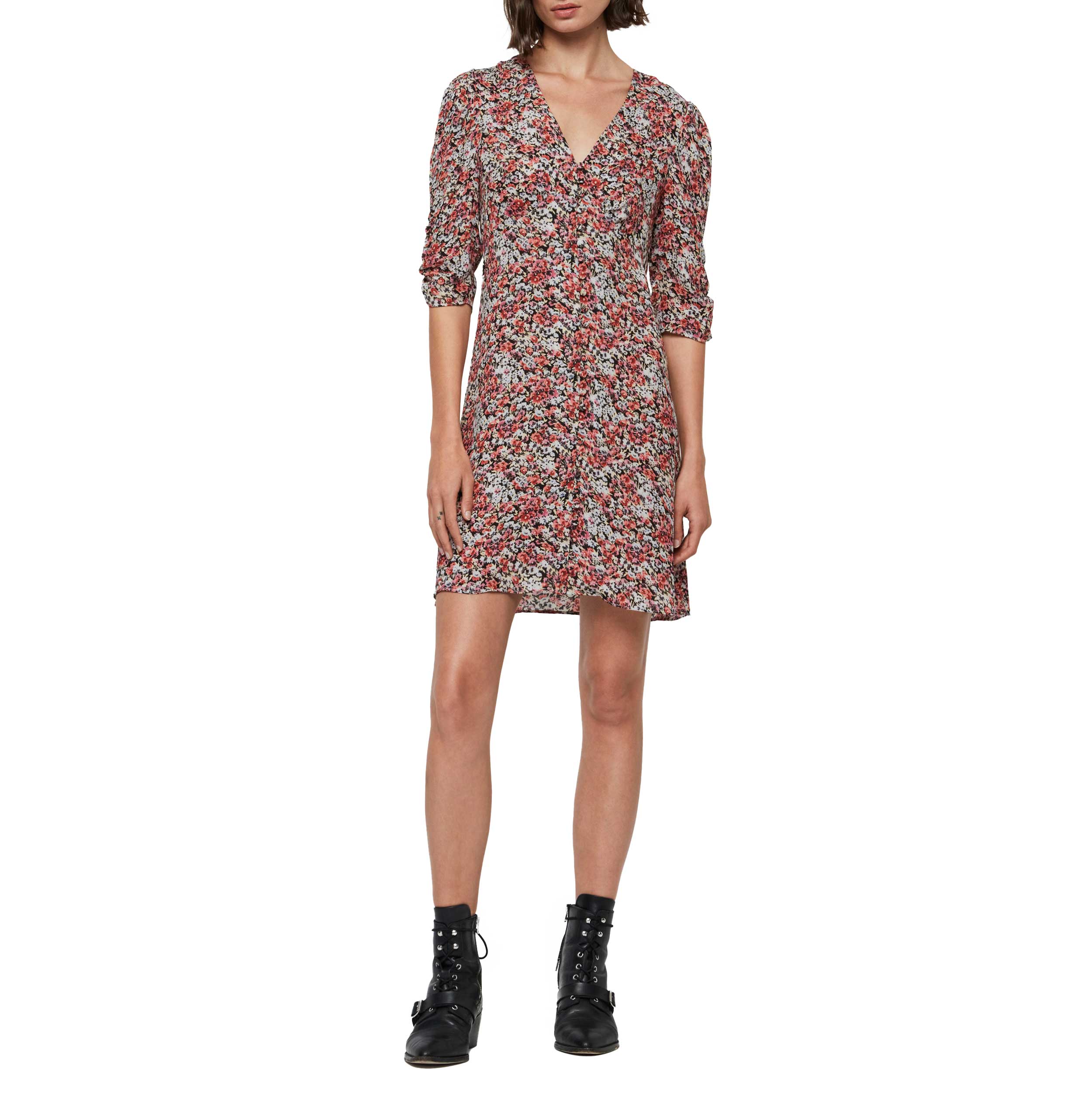 VESTIDO CORTE ENTALLADO, CUELLO EN V, SIN MANGAS, TIRANTES FINOS, ESTAMPADO FLORAL EN TODA LA PRENDA, FORRO DE CAMISETA EXTRAÍBLE, MARCA ALLSAINTS. COMPOSICIÓN: 100% VISCOSA. INSTRUCCIONES DE LAVADO: LAVADO EN SECO.