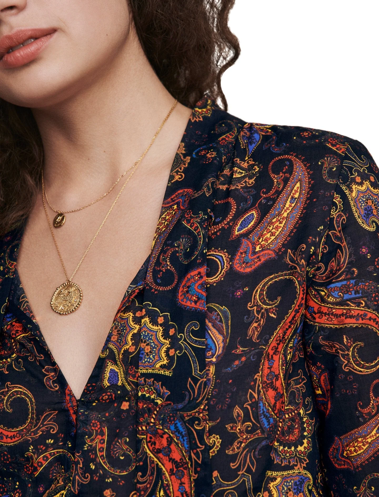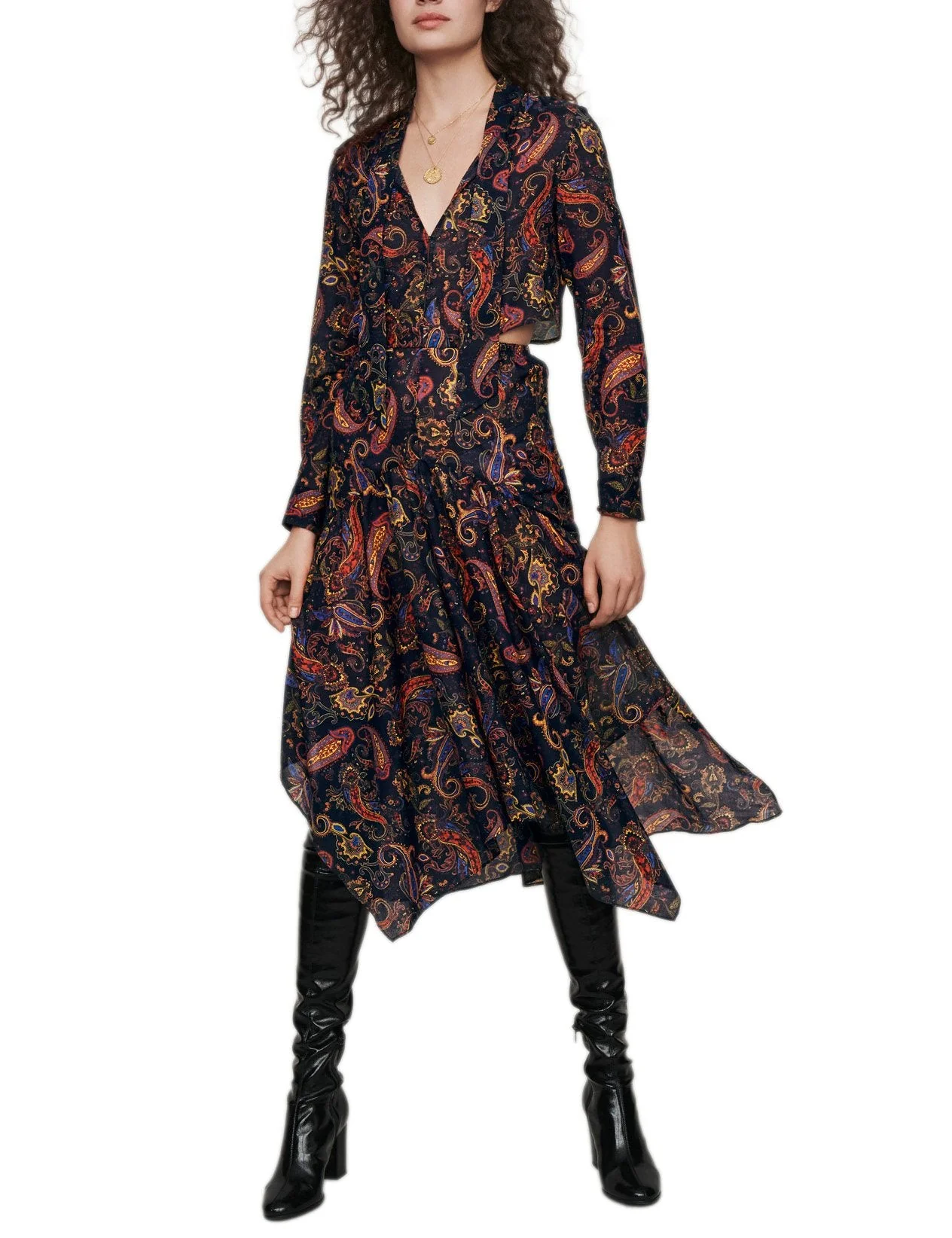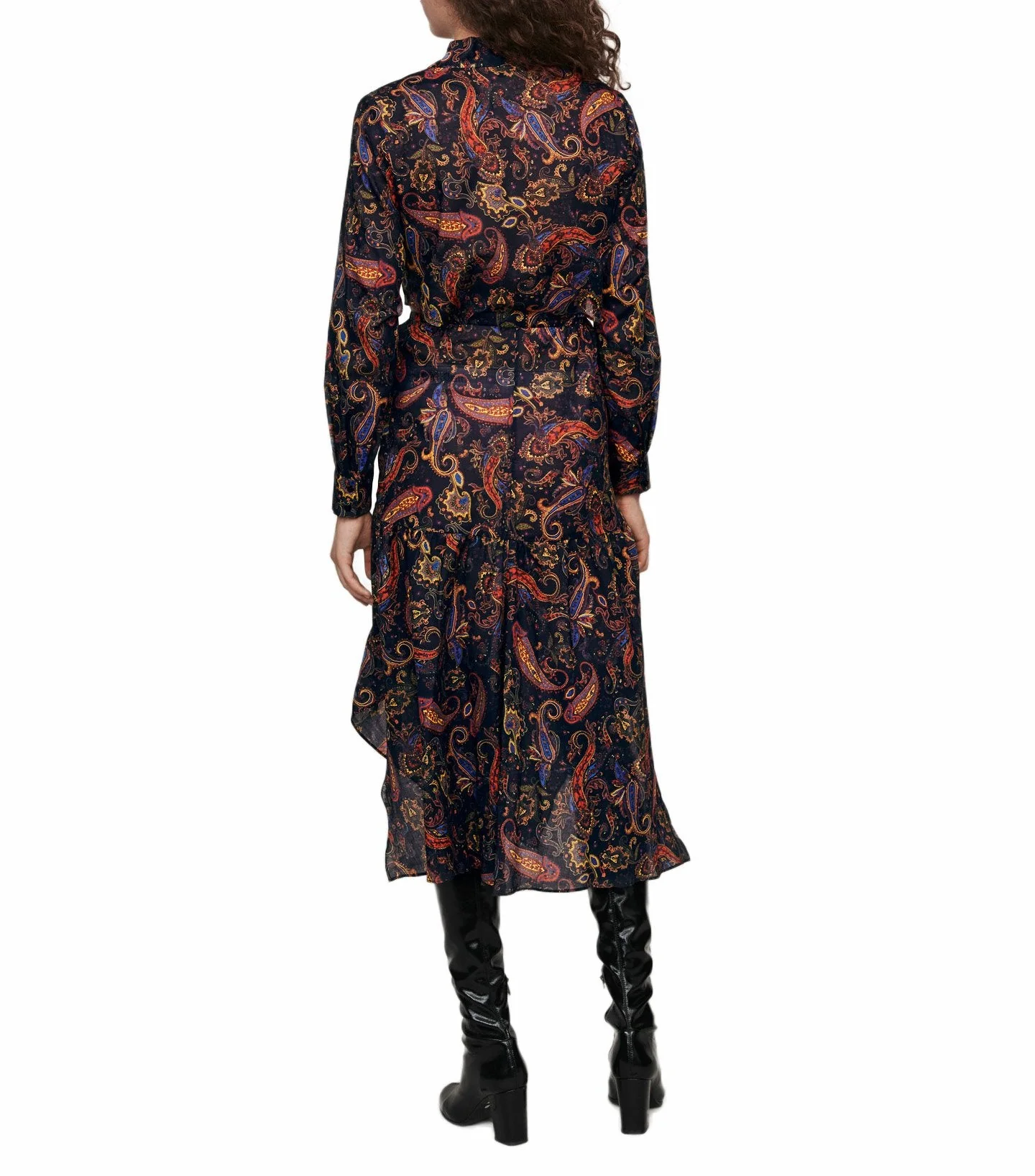 VESTIDO ESCOTE EN V, CUELLO ANUDADO, MANGA LARGA, PUÑOS ABOTONADOS, DETALLES DE ABERTURAS EN LOS COSTADOS, ESTAMPADO DE PASLEY, FALDA FRUNCIDA, CINURILLA ELÃSTICA EN LA PARTE POSTERIOR, MARCA MAJE. 100% ALGODÓN. LAVADO A MANO.