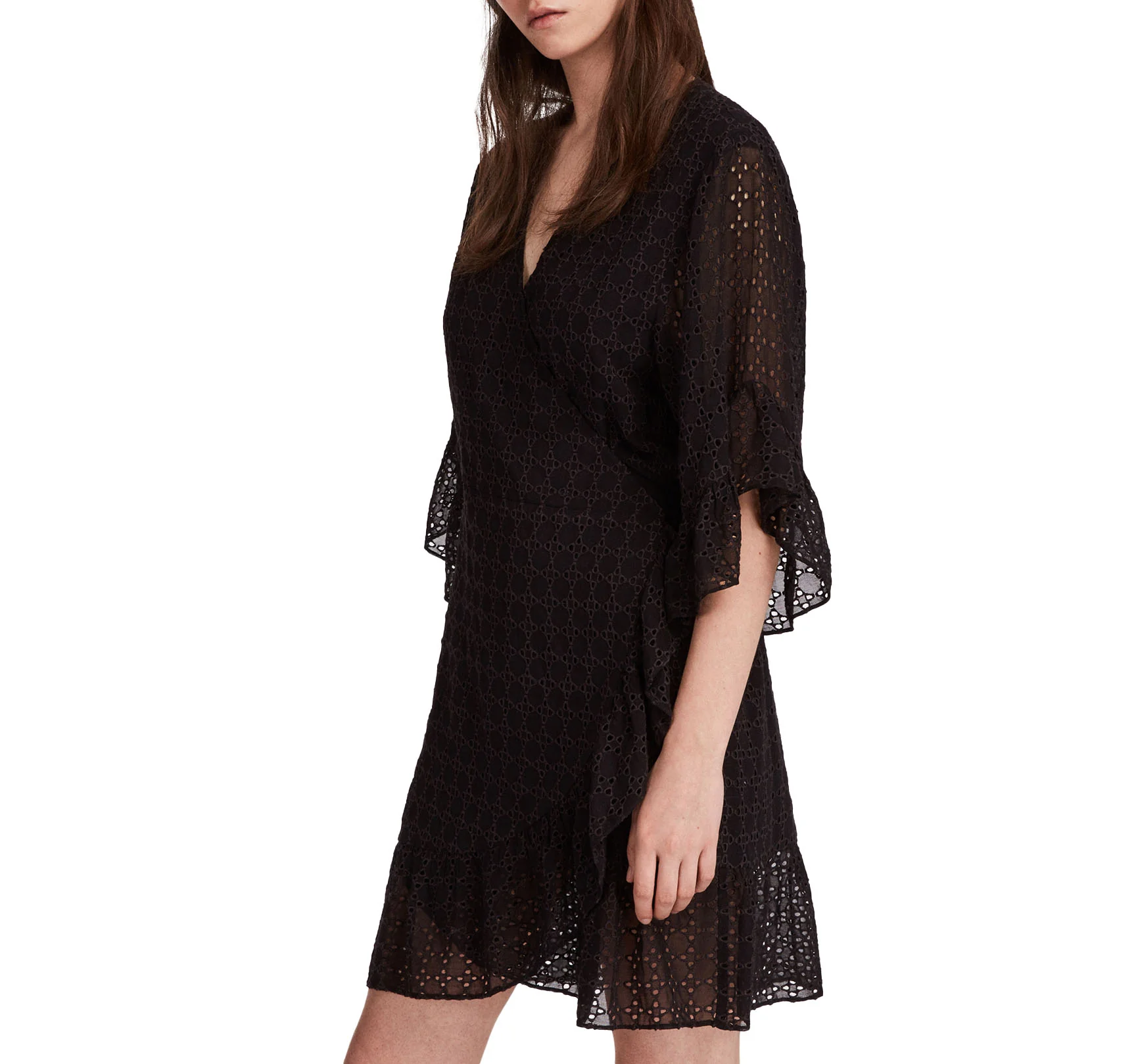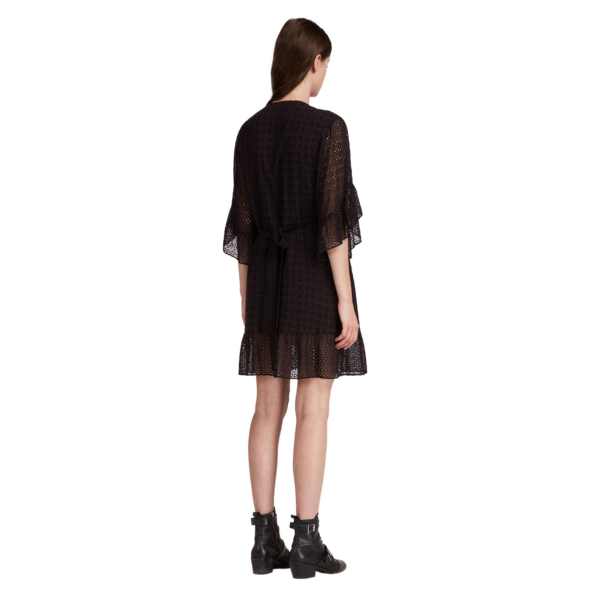 VESTIDO MARLOW ETTE, MARCA ALLSAINTS. VESTIDO CORTO DE ENCAJE ENVOLVENTE, MANGA 3/4 CON VOLANTES, VOLANTE ABAJO, NEGRO. 100% VISCOSA. LAVADO EN SECO.