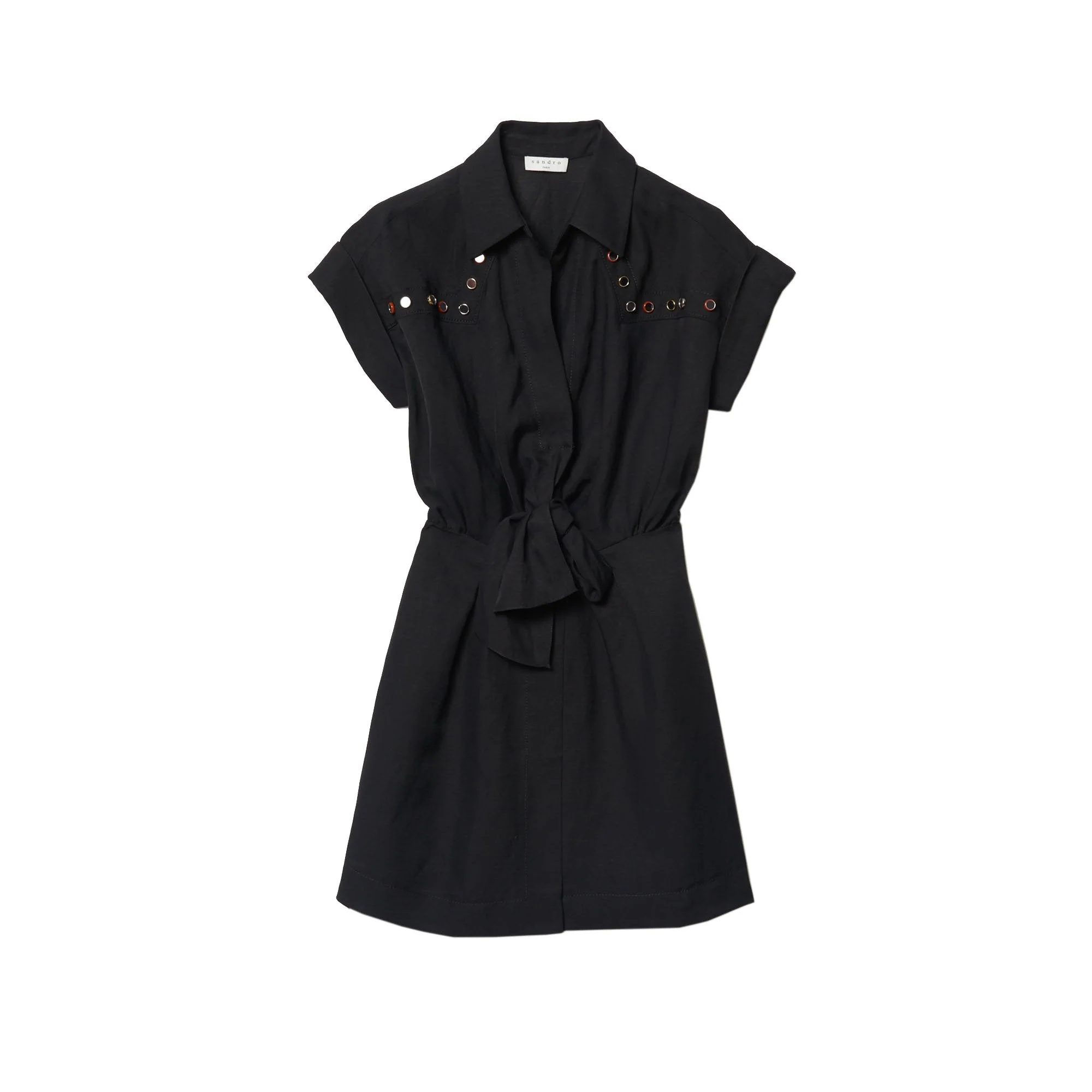 VESTIDO CORTO MANGA CORTA CON AMARRE FRONTAL Y DETALLES DE ESTOPEROLES, MARCA SANDRO. 67% VISCOSA 33% LINO. LIMPIEZA EN SECO PROFESIONAL. REVISAR ETIQUETA INTERNA DE LAVADO PARA MÁS INFORMACIÓN.