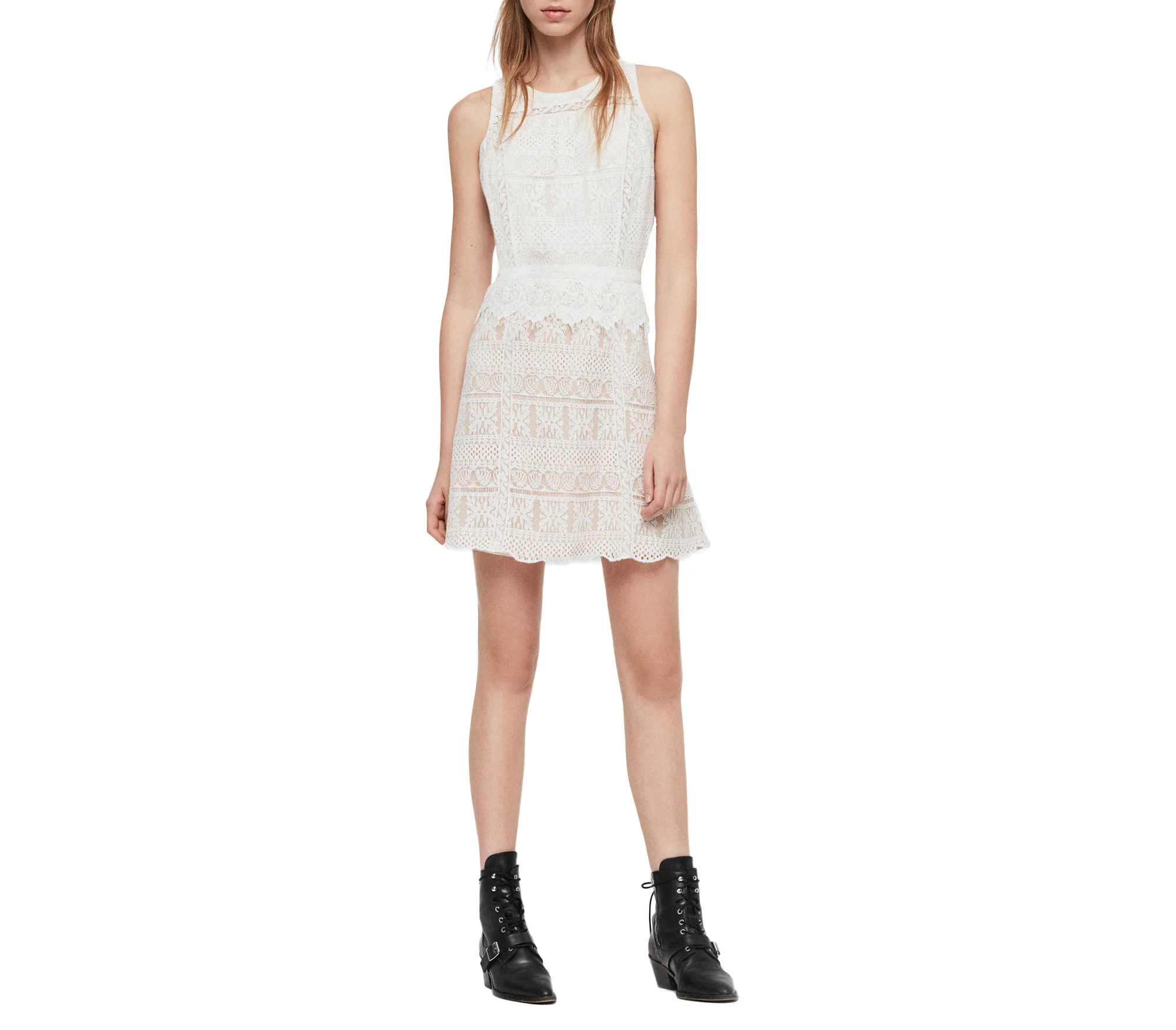 VESTIDO MELIA, MARCA ALLSAINTS. VESTIDO DE ENCAJE CORTE RECTO SIN MANGAS Y CREMALLERA OCULTA EN LA ESPALDA, FONDO BEIGE.