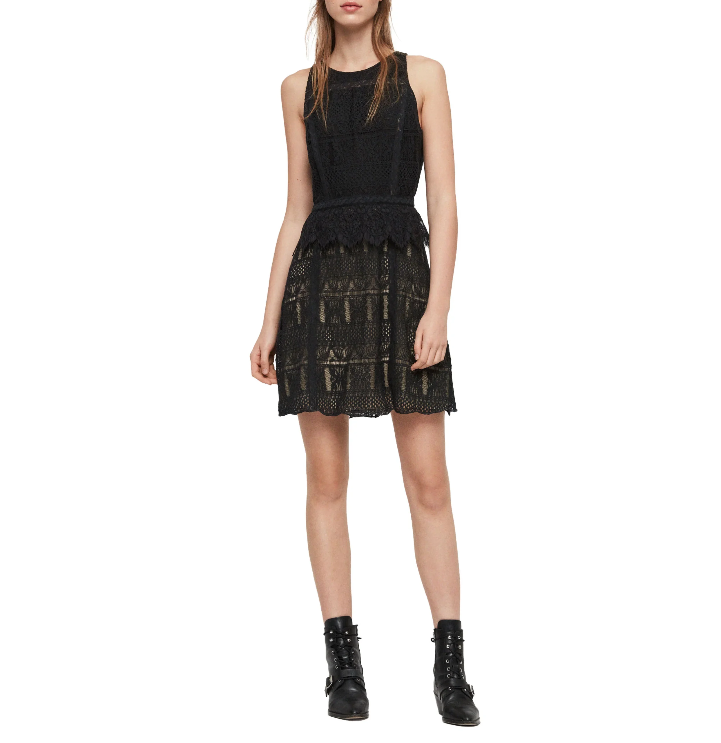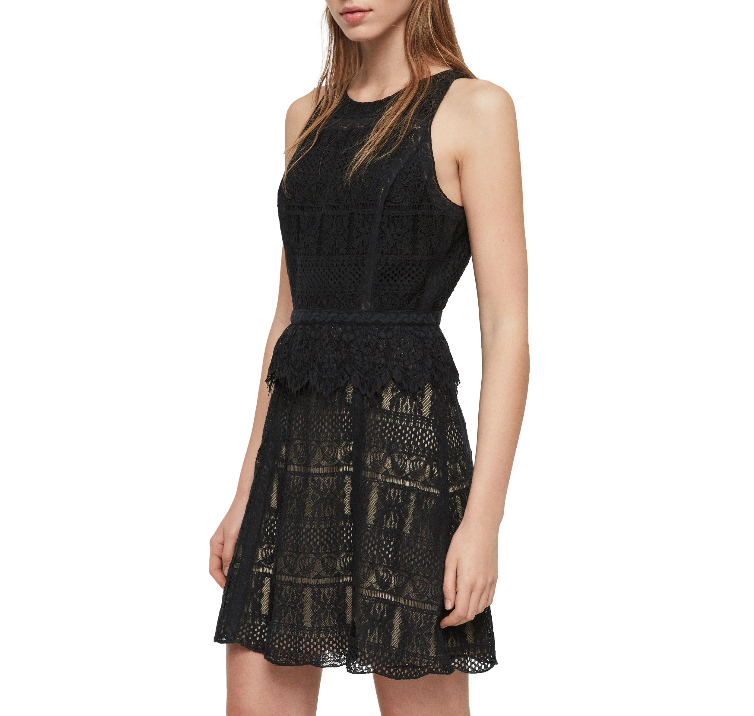 VESTIDO MELIA, MARCA ALLSAINTS. VESTIDO DE ENCAJE CORTE RECTO SIN MANGAS Y CREMALLERA OCULTA EN LA ESPALDA, FONDO BEIGE.