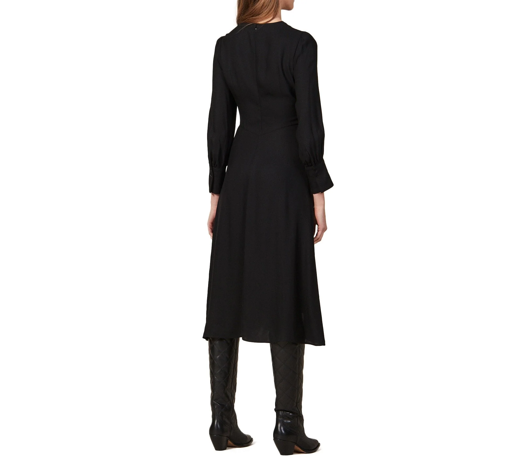 VESTIDO LARGO, MANGA LARGA, ESCOTE V Y DRAPEADO FRONTAL, MARCA SANDRO. 100% VISCOSA. LIMPIEZA EN SECO PROFESIONAL. REVISAR ETIQUETA INTERNA DE LAVADO PARA MÁS INFORMACIÓN.