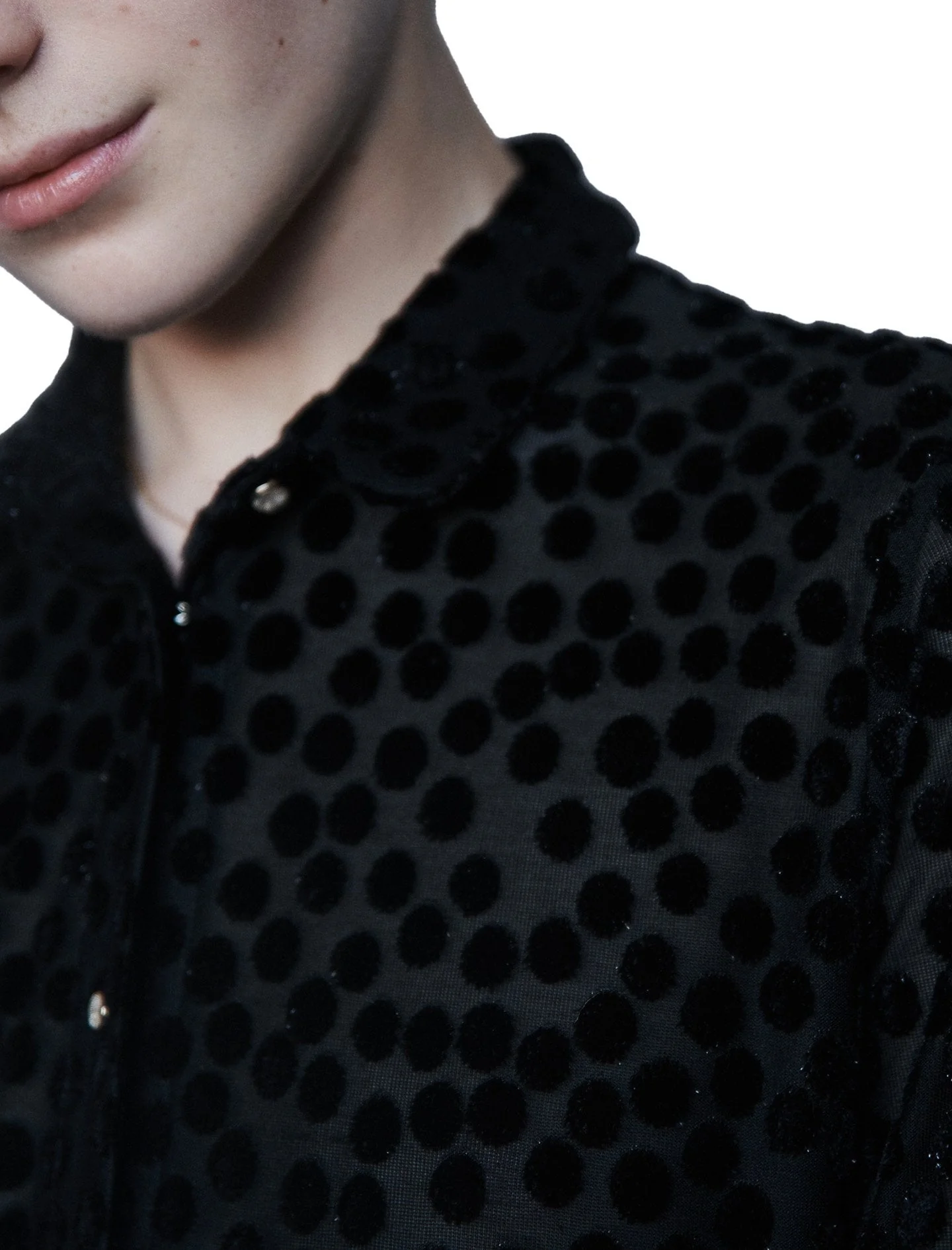VESTIDO NEGRO, MARCA MAJE. VESTIDO CAMISERO EN TERCIOPELO MANGA LARGA, FALDA AVOLANTADA, NEGRO. 95% POLIESTER, 5% ELASTANO. FORRO: 100% VISCOSA. LAVADO: LAVADO A MANO DEDLICADO. BLANQUEADOR: SIN BLANQUEADOR. SECADORA: NO USAR SECADORA.