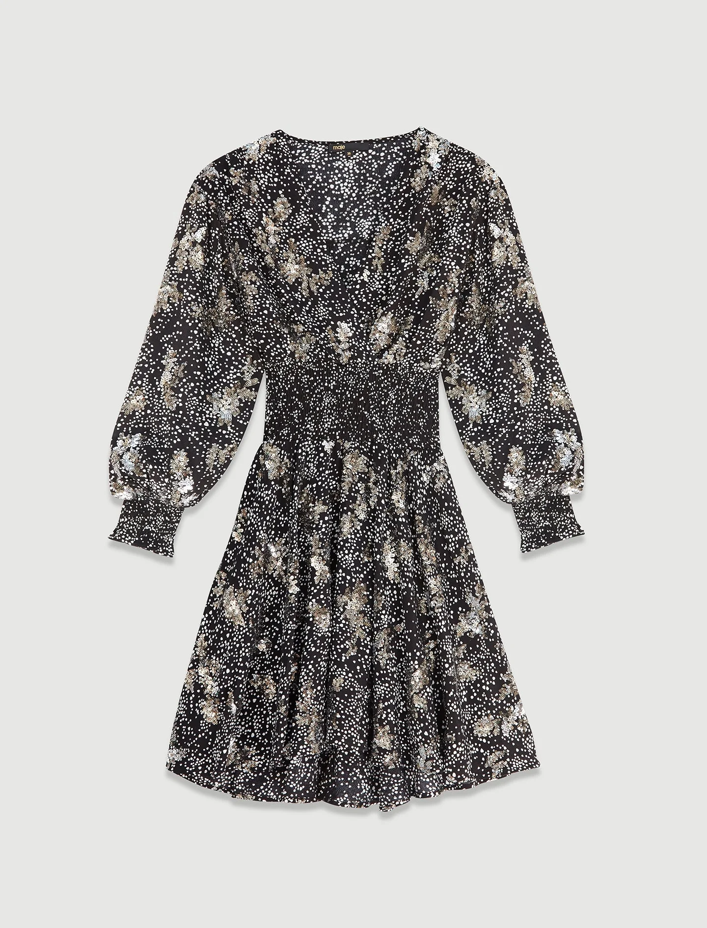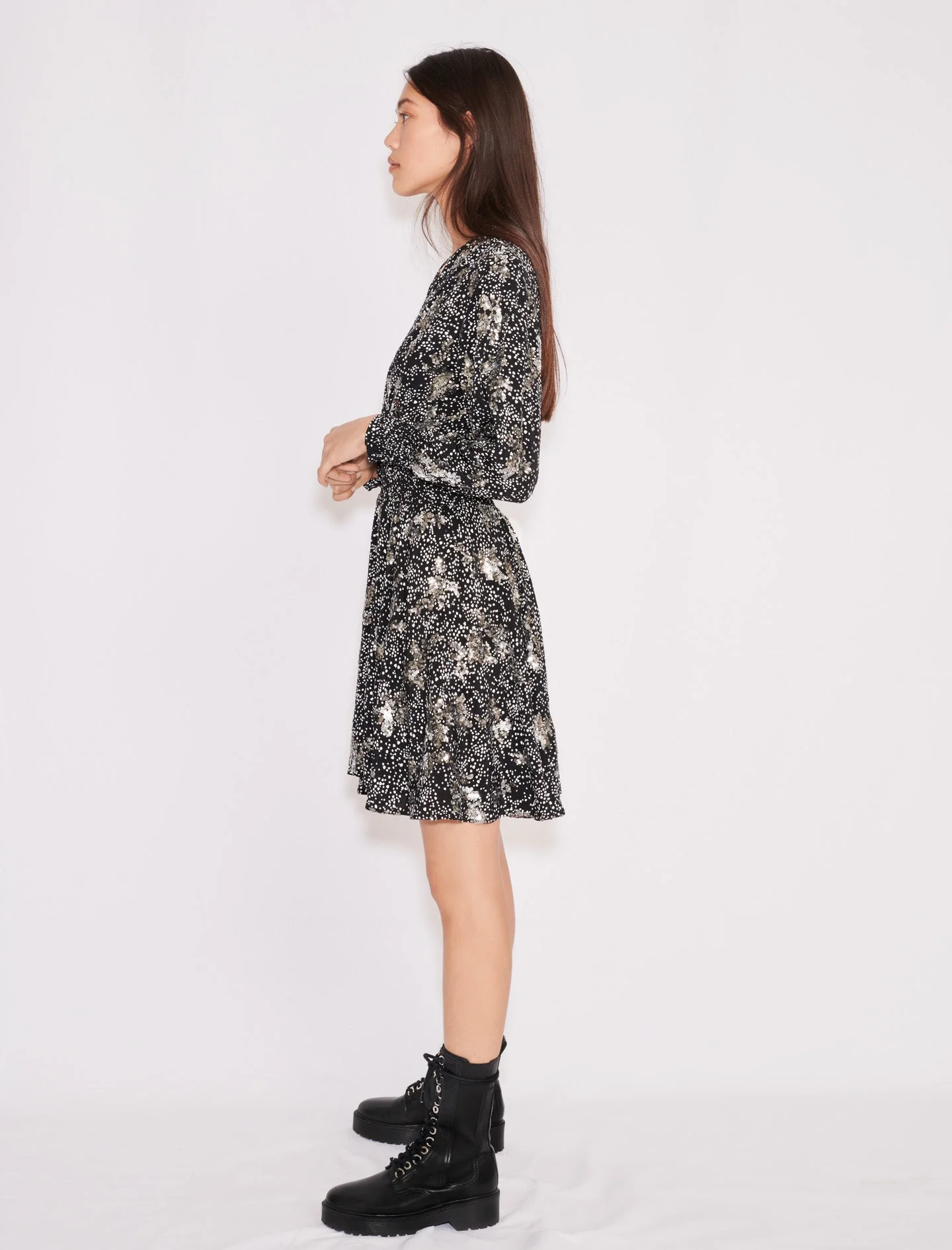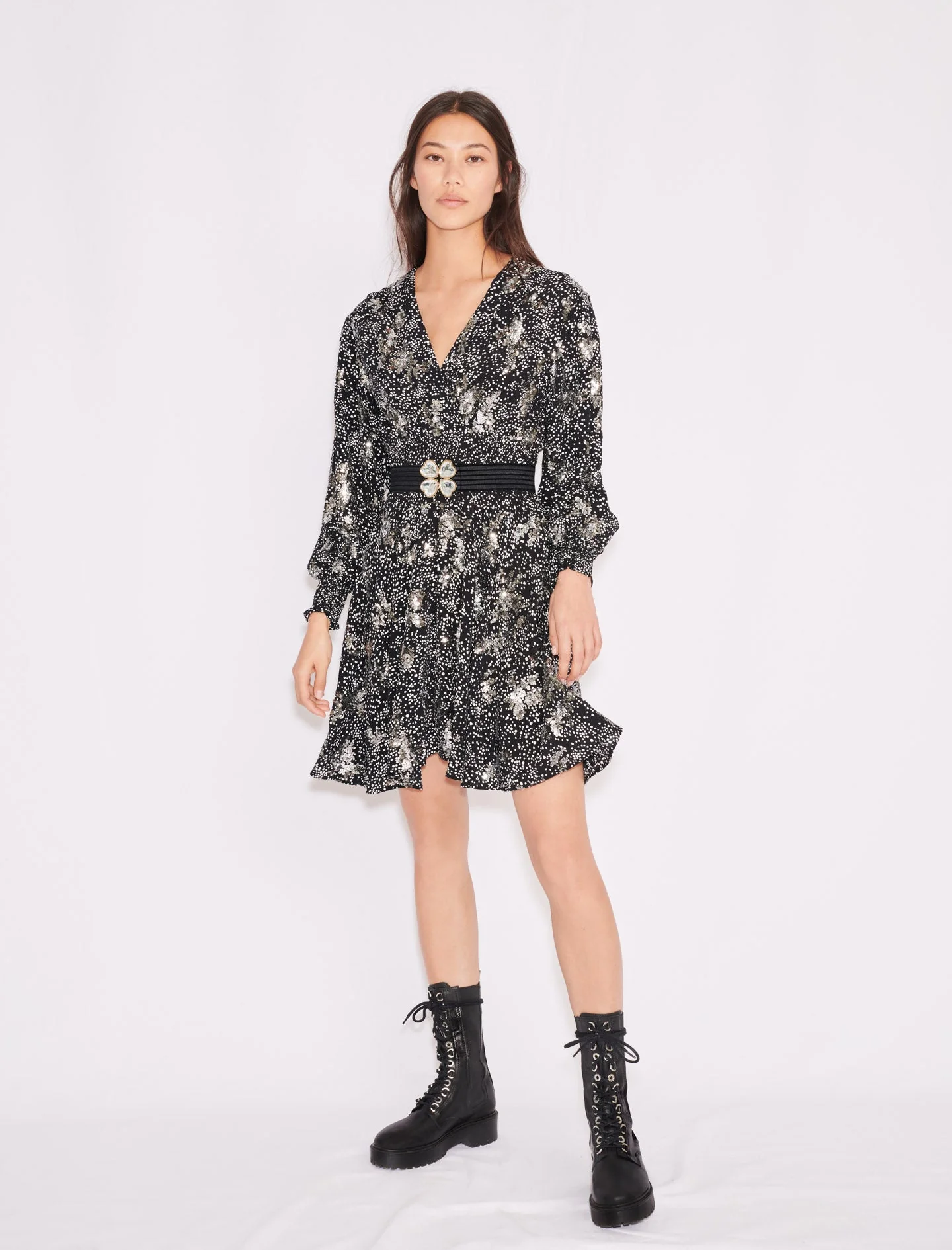 Vestido de crepé negro con estampado de corazones pequeños blancos y lentejuelas bordadas. Corte corto, manga larga y escote de pico. Cintura marcada con una cinturilla aplicada. Vestido fluido Vestido de noche Vestido de tiro alto con cinturón