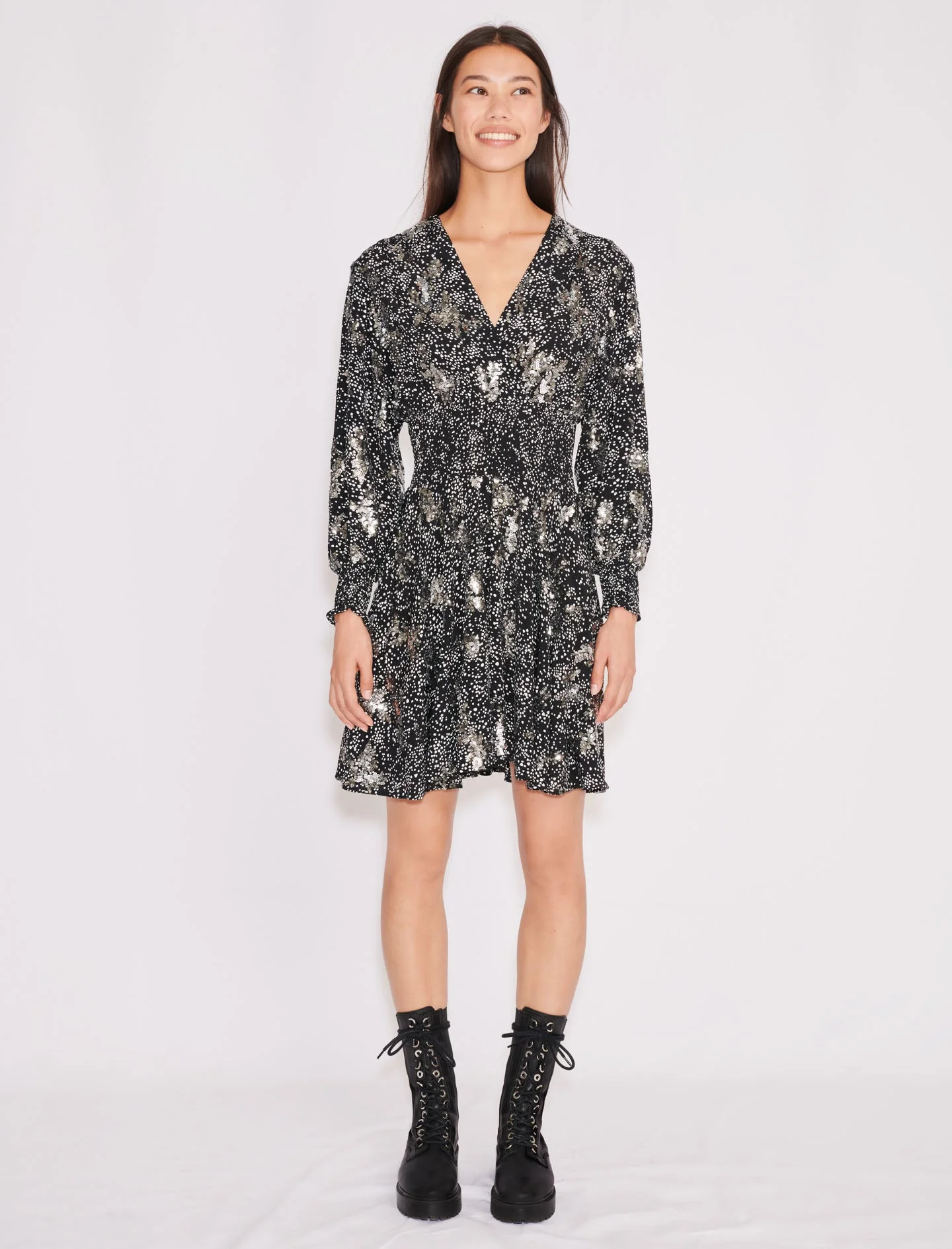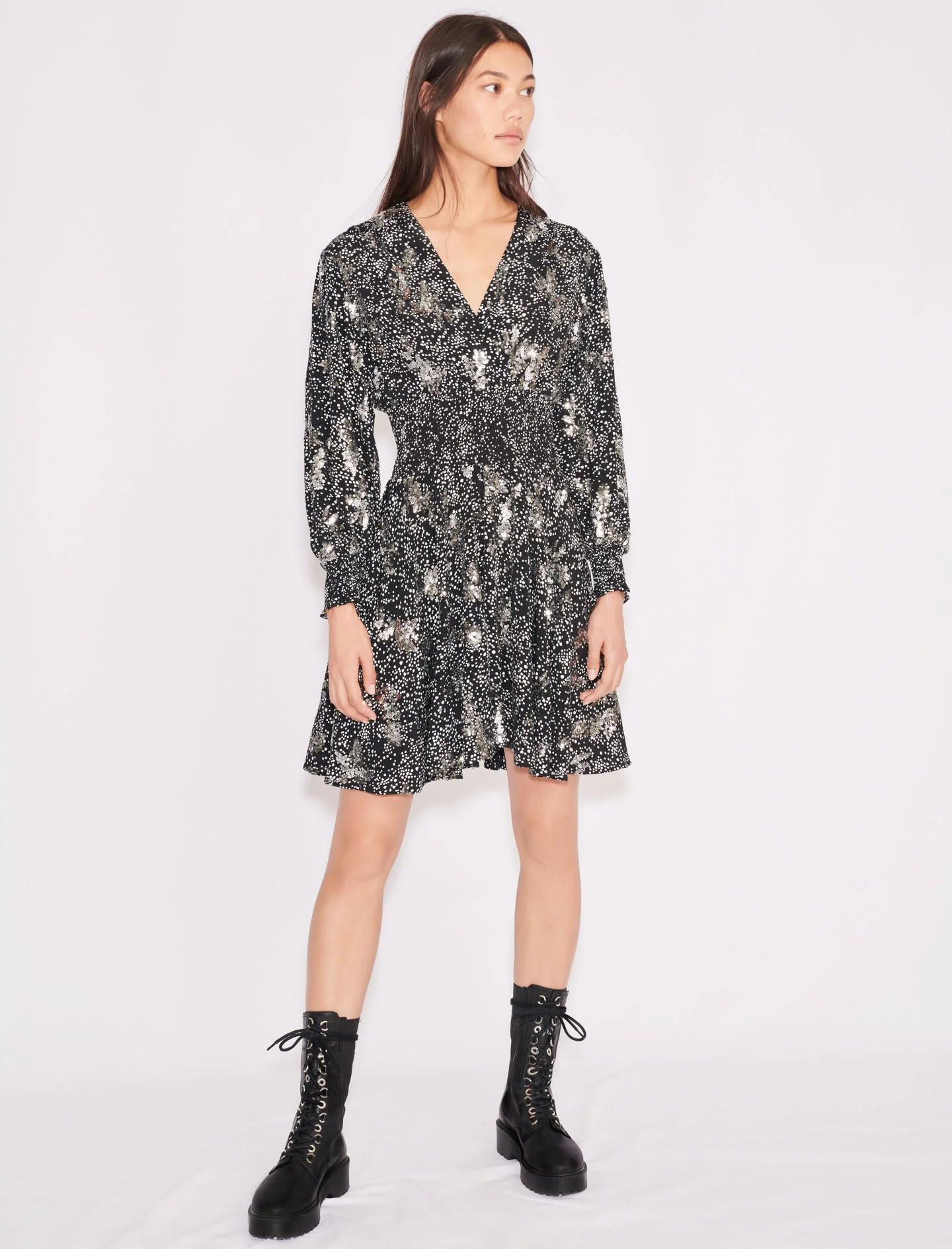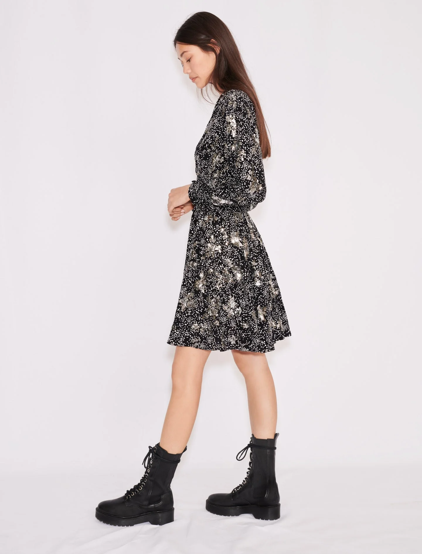Vestido de crepé negro con estampado de corazones pequeños blancos y lentejuelas bordadas. Corte corto, manga larga y escote de pico. Cintura marcada con una cinturilla aplicada. Vestido fluido Vestido de noche Vestido de tiro alto con cinturón