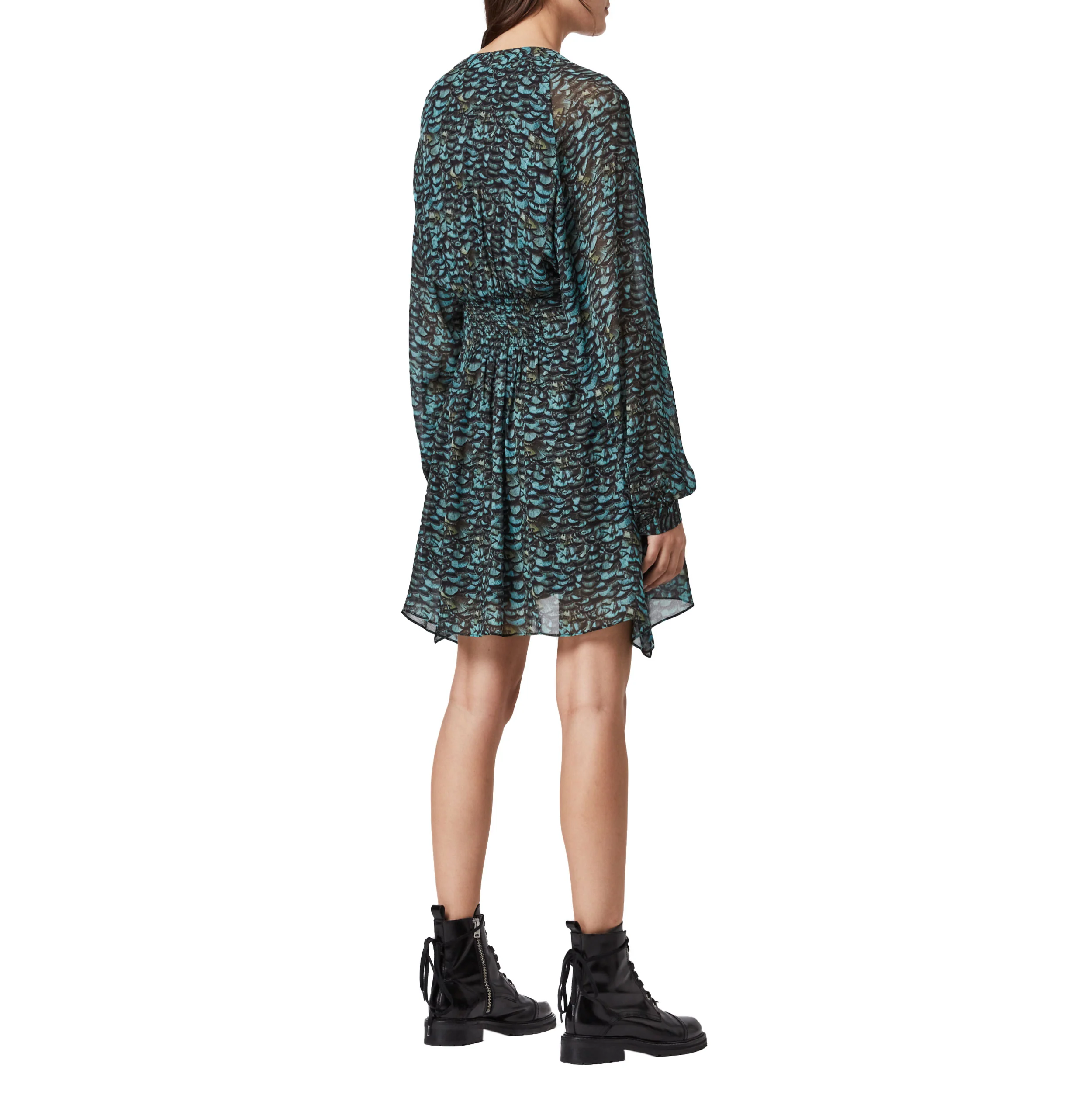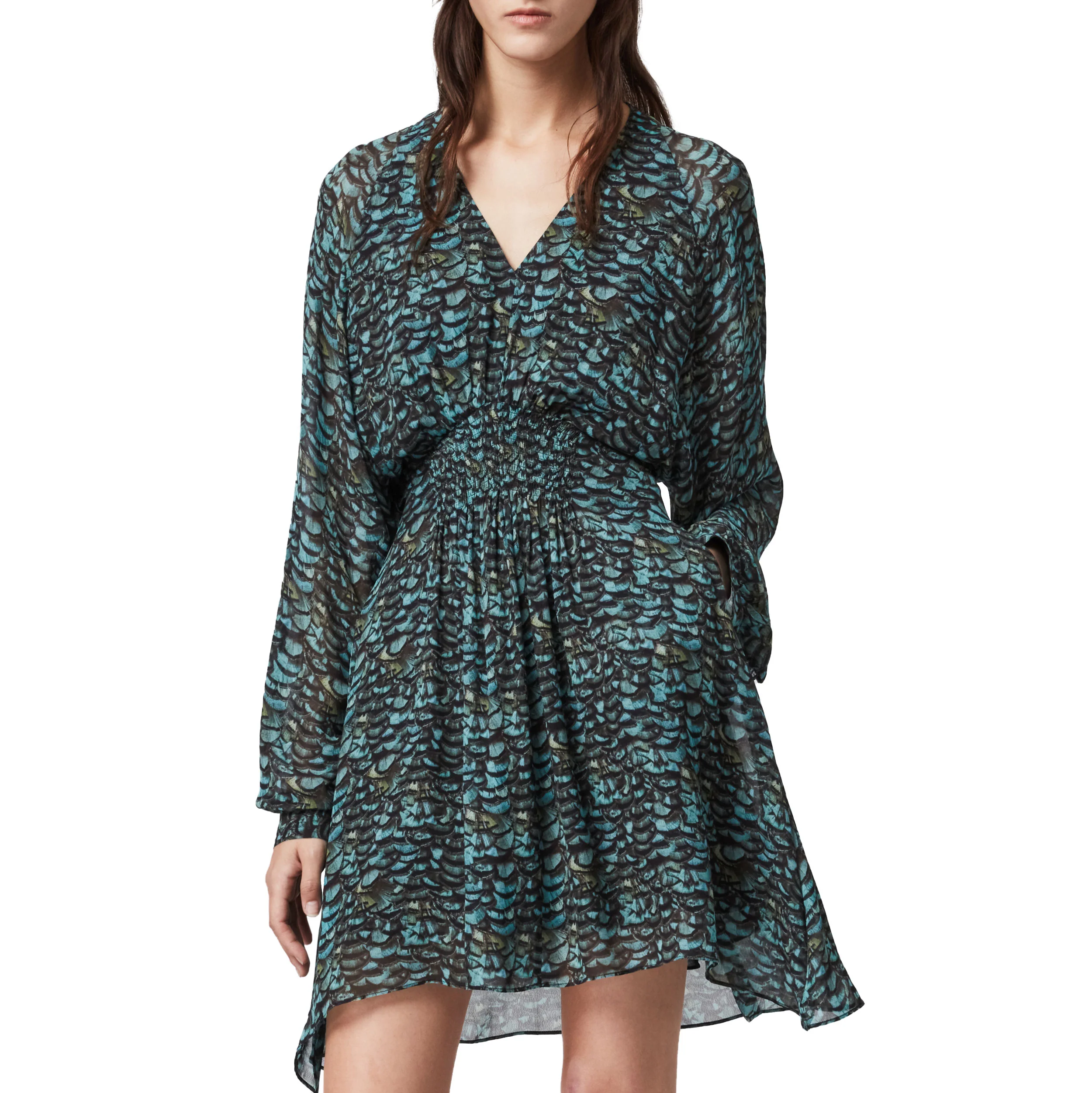 VESTIDO CORTO CUELLO DE PICO, MANGAS CON CAPUCHA, PANEL ACAMPANADO EN LA CINTURA, ESTAMPADO FLORAL COMPLETO, ENVOLTURA EN EL PECHO, DOBLADILLO CURVO, CIERRE CON CREMALLERA OCULTA EN LA ESPALDA, MARCA ALLSAINTS. COMPOSICIÓN: PRINCIPAL: 100% VISCOSA