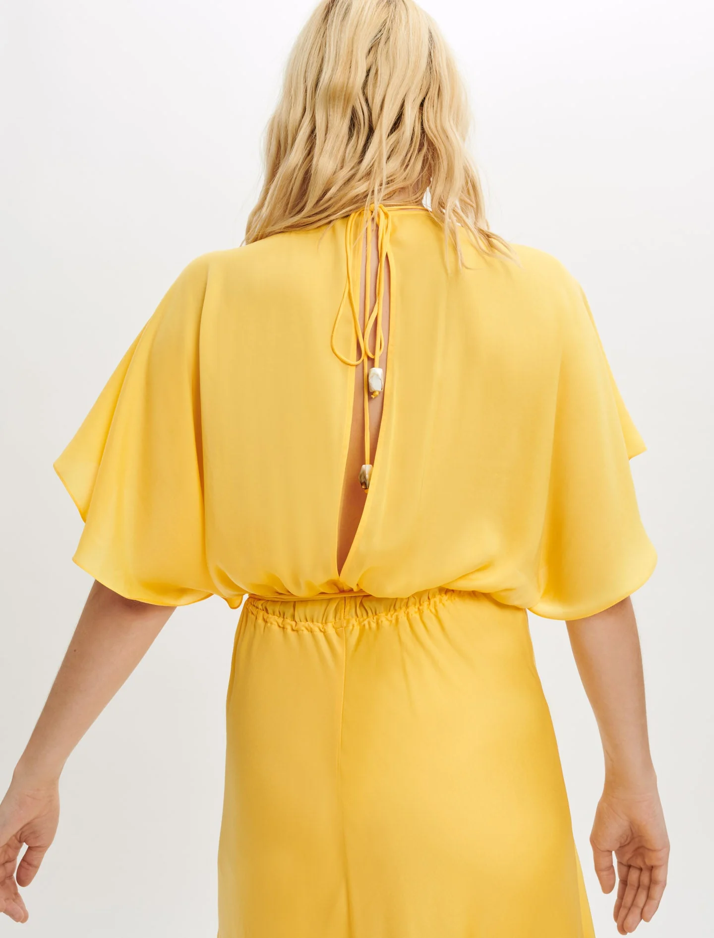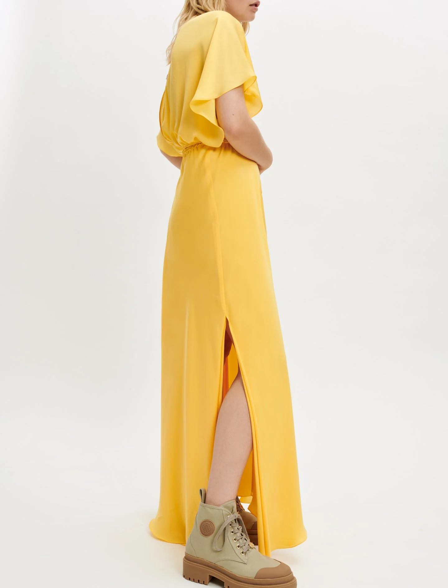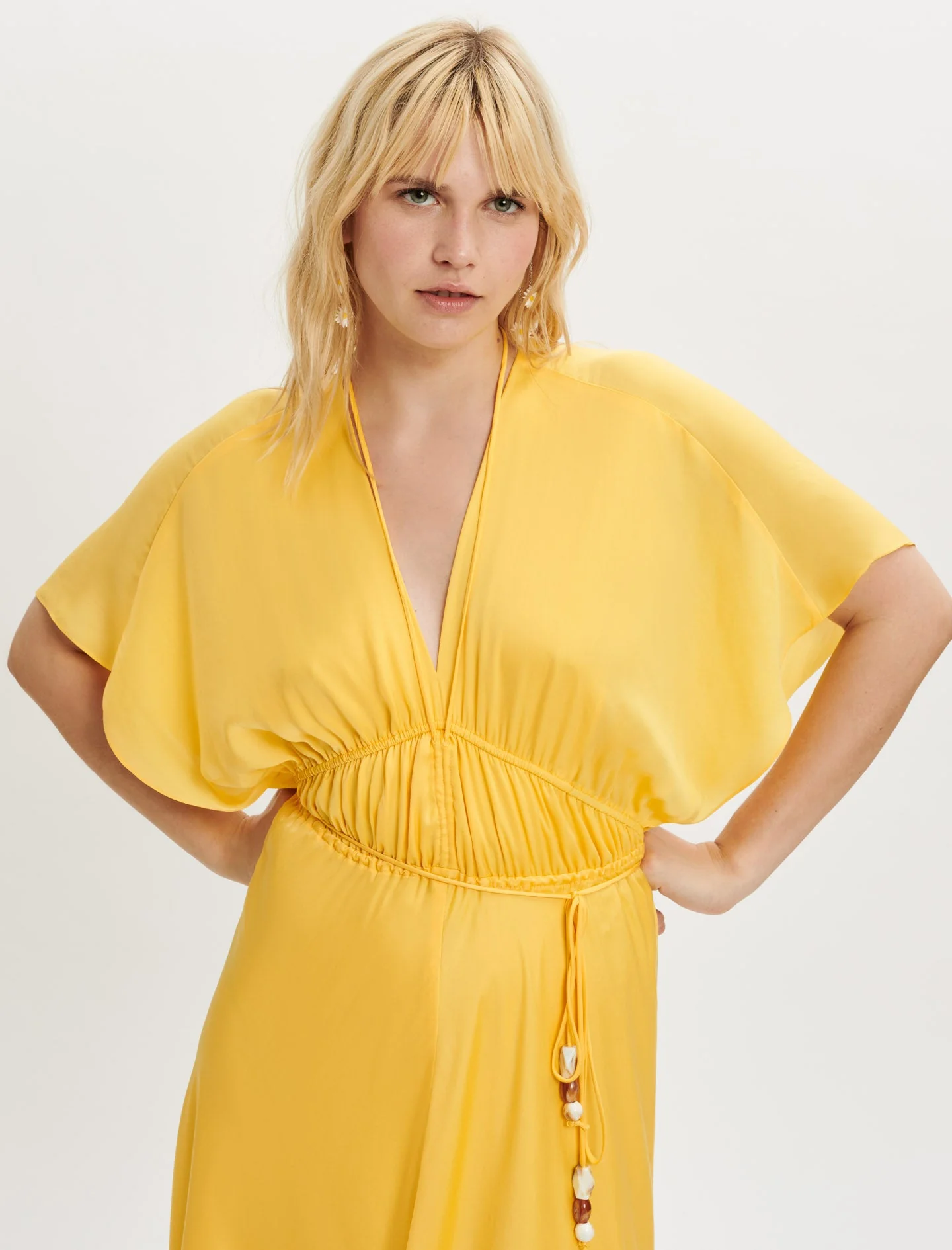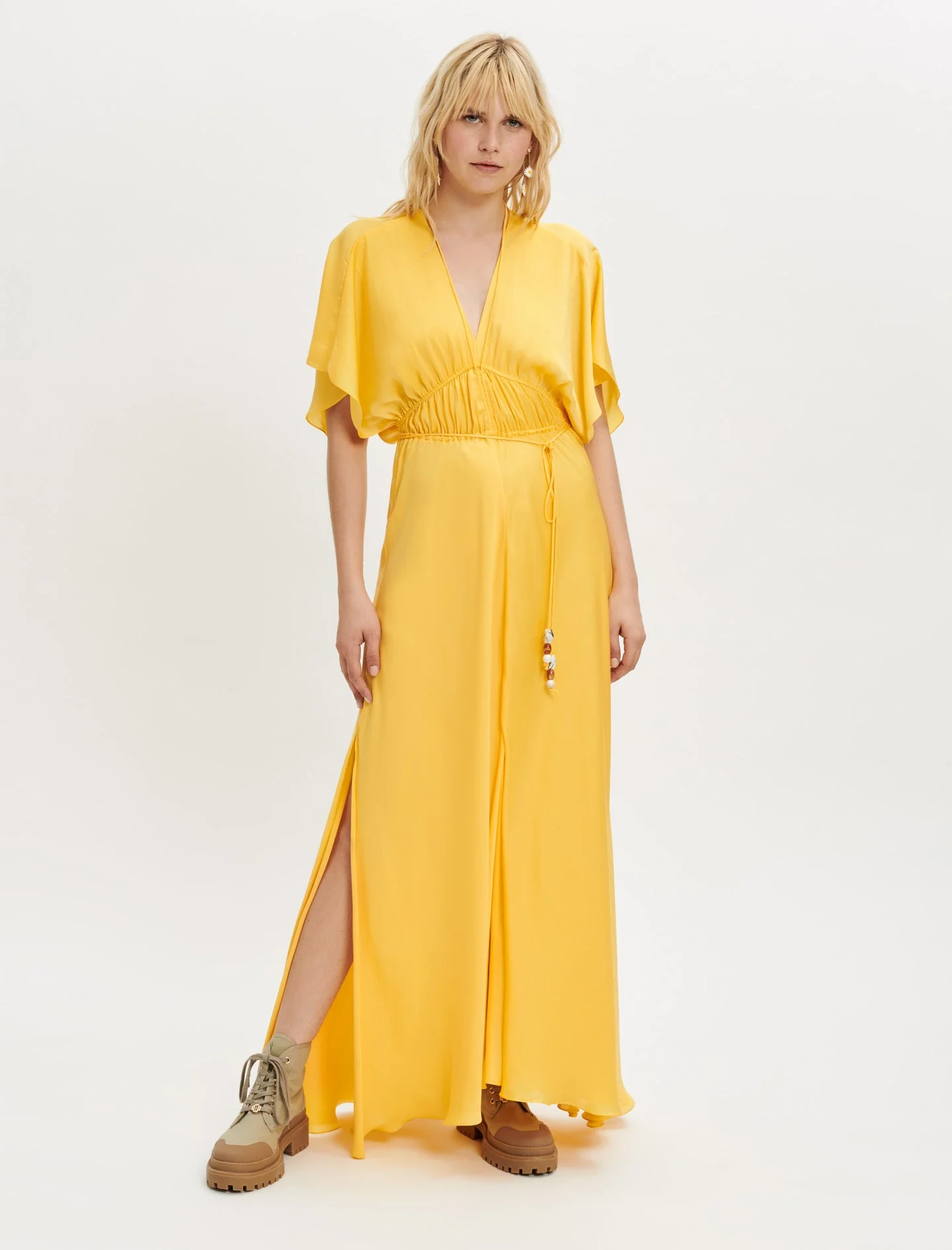 Vestido largo asimétrico de raso fluido. Mangas cortas y amplias. Escote de pico. Cordones y botones para cerrar la abertura trasera. Cinturilla elástica y cinturón extraíble con cuentas. Vestido de ceremonia.