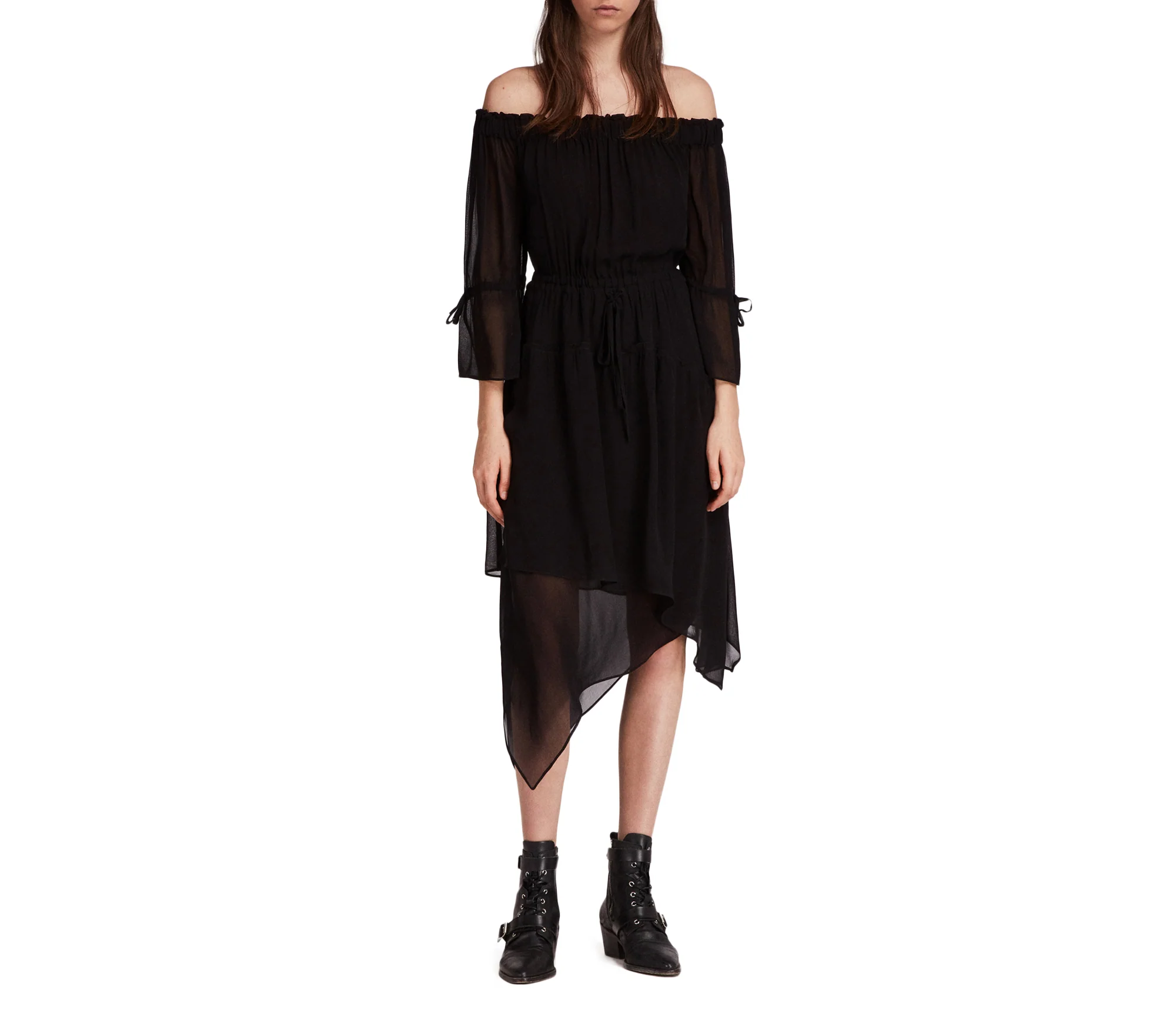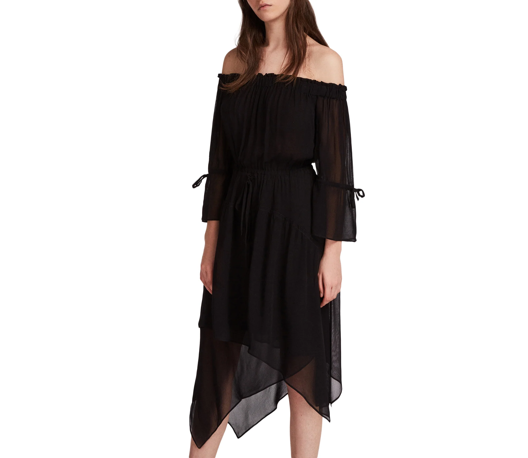 VESTIDO RINA, MARCA ALLSAINTS. VESTIDO CORTO, ESCOTE ELÁSTICO FUERA DEL HOMBRO, MANGAS LARGAS TRANSPARENTES, CORBATAS EN LAS MANGAS Y LA CINTURA, POR DEBAJO DE LA RODILLA, FALDA CON GRADAS. 100% POLIÉSTER. LAVAR A MÁQUINA AL REVÉS.
