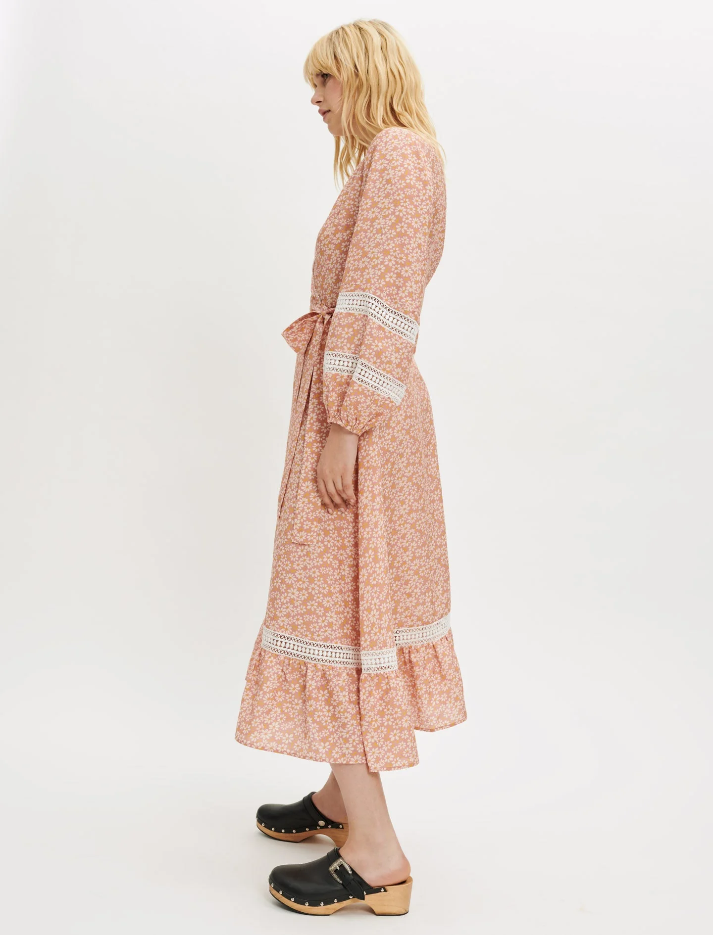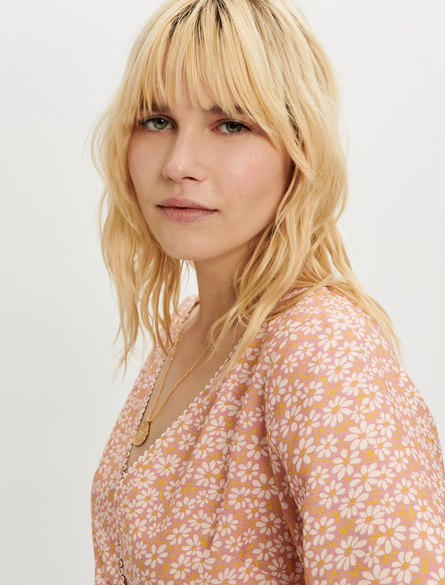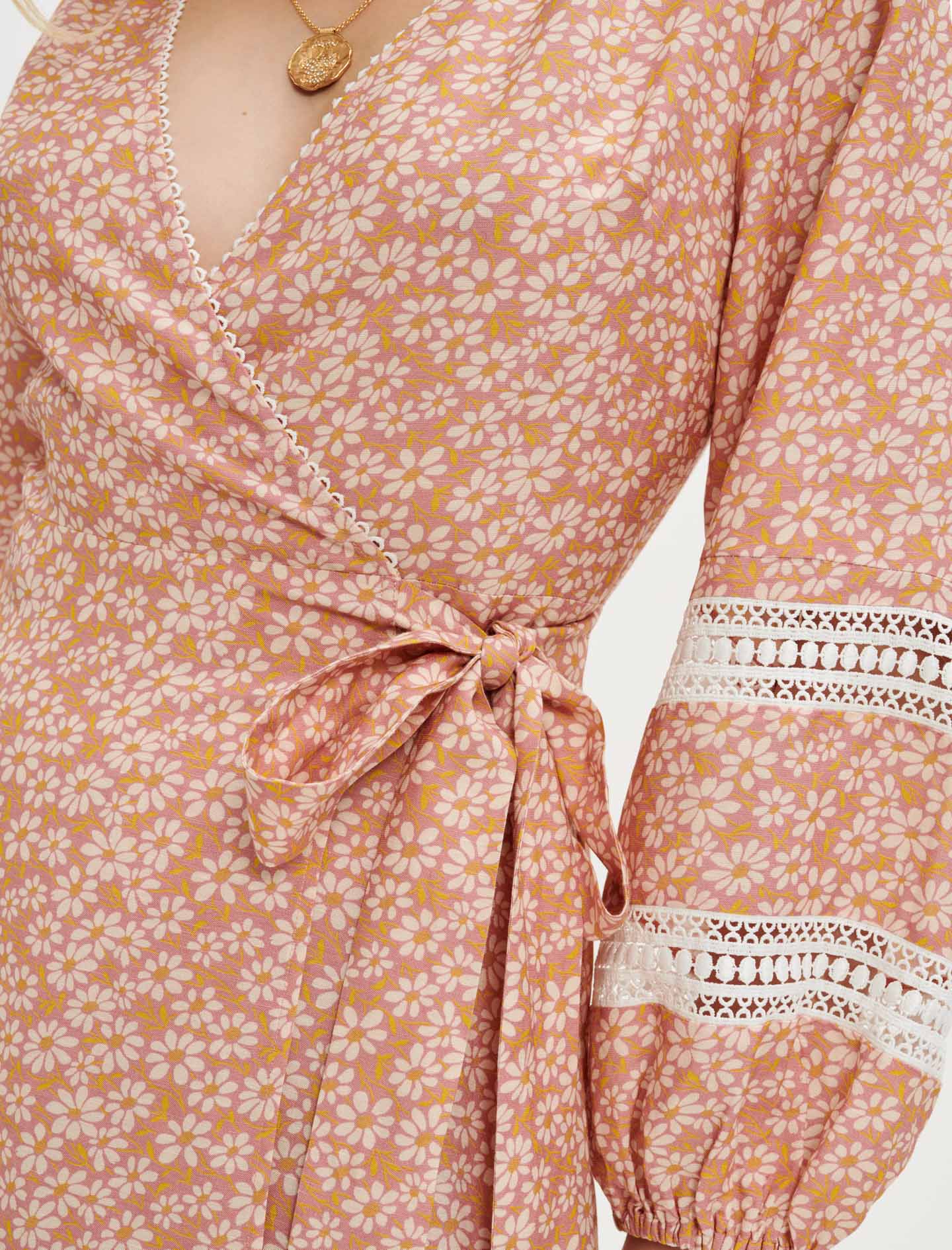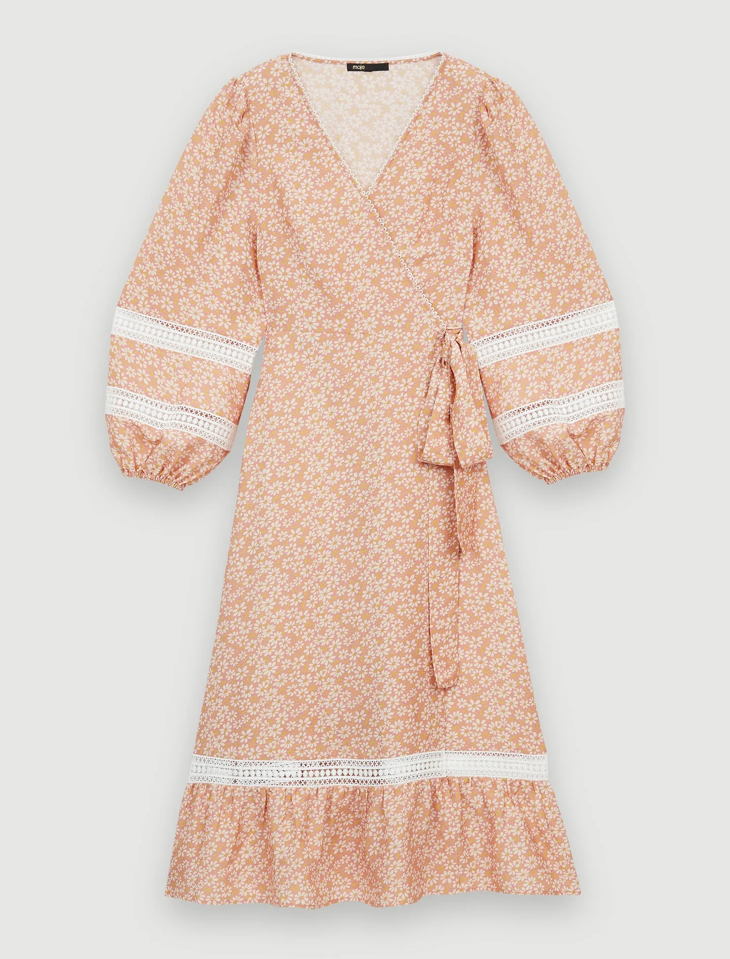 Vestido midi holgado con estampado de margaritas. Mezcla de viscosa y lino. Mangas largas y amplias ajustadas en el puño con una goma. Escote de pico cruzado. Cinturón para anudar en la cintura. Volantes en el bajo. Tiras de encaje en las mangas y en el bajo. Bolsillos laterales. Vestido de ceremonia.