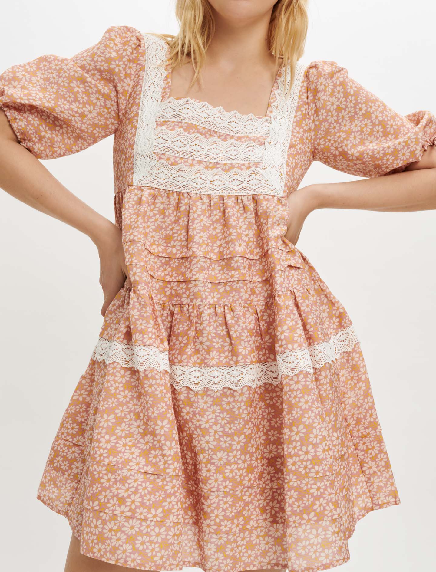 Vestido corto holgado con estampado de margaritas. Mezcla de viscosa y lino. Mangas cortas y amplias ajustadas en la parte inferior con cordones. Escote cuadrado. Bolsillos laterales. Volantes y tiras de encaje de algodón. Vestido de día o de ceremonia.