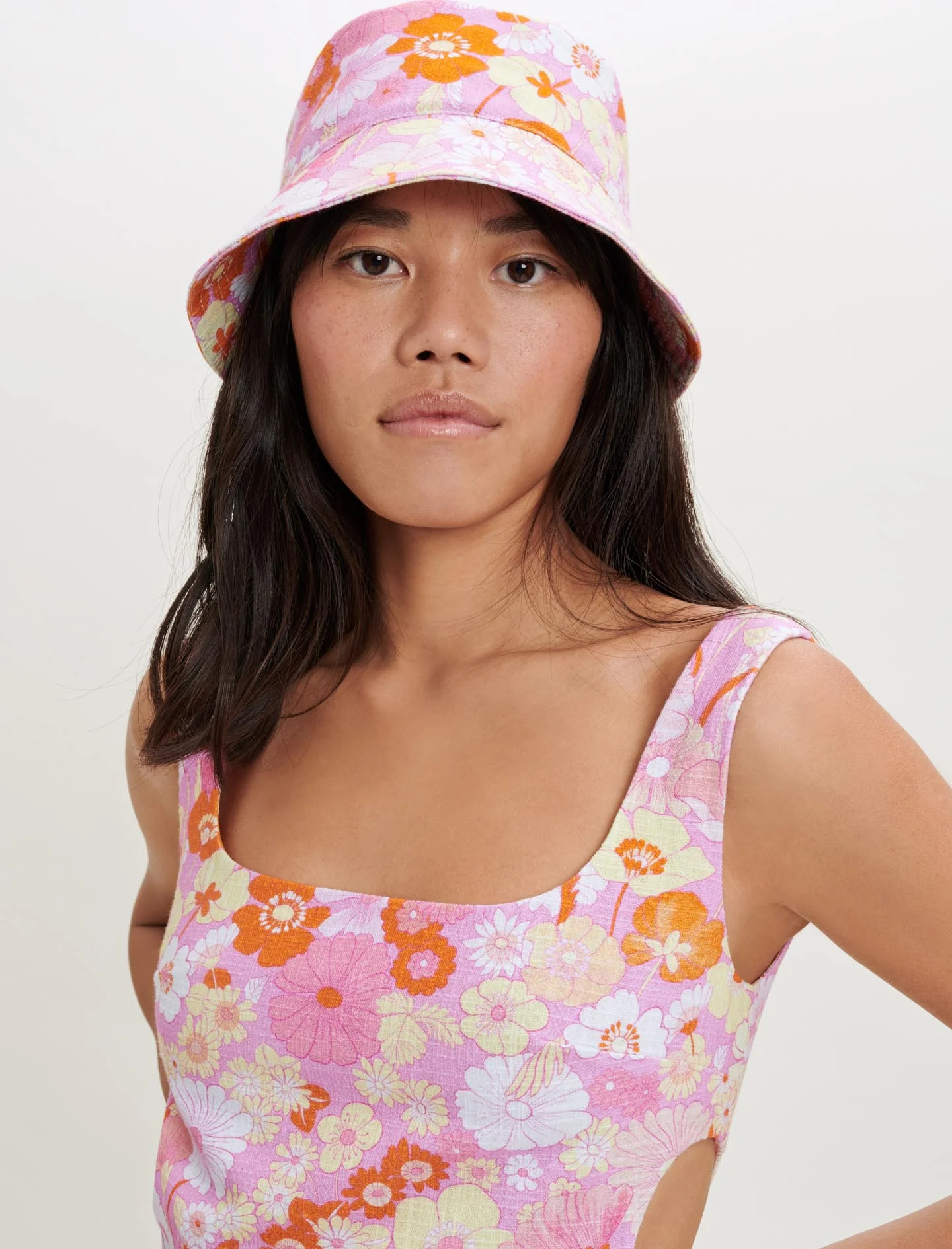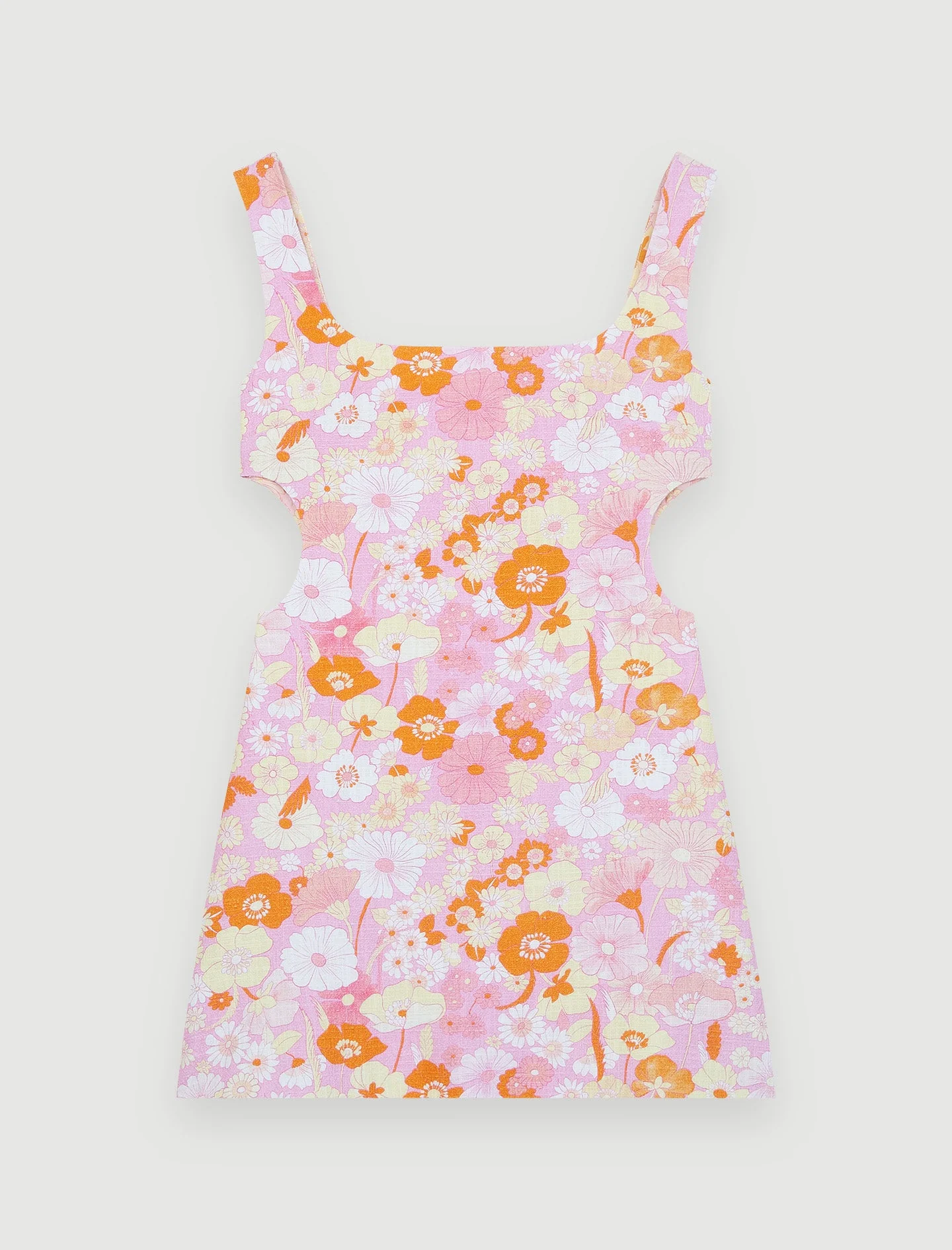 Vestido corto de algodón, ligeramente entallado. Tirantes anchos. Estampado Flower Power rosa. Aberturas laterales en la cintura. Cuello redondo y ligeramente escotado. Cremallera en la parte trasera. Vestido de día o de ceremonia.