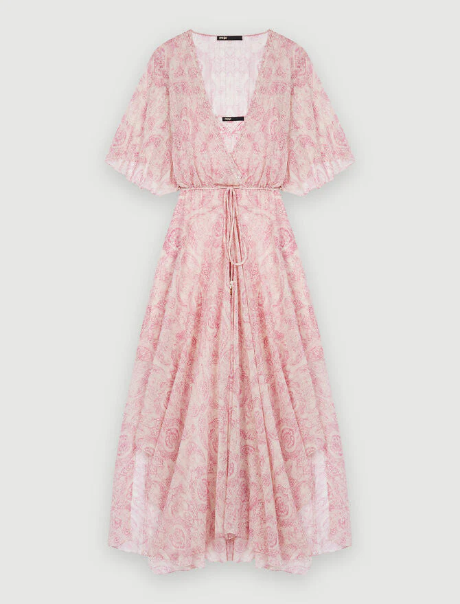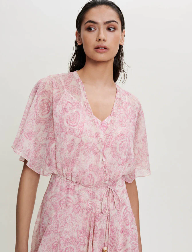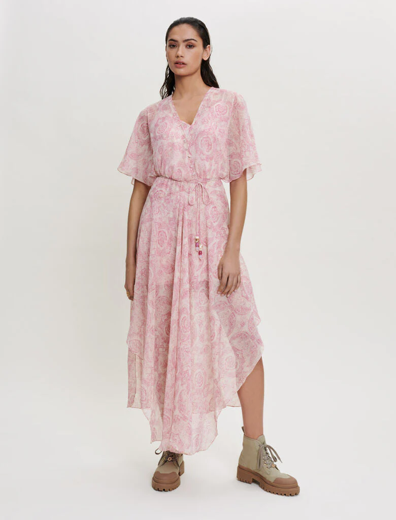 Vestido largo, amplio y fluido, asimétrico en la parte inferior y ajustado en la cintura. Gasa fluida con un librillo. Estampado cachemir. Mangas cortas y amplias. Forro de viscosa extraíble estampado. Escote de pico. Botones pequeños forrados. Cinturón desmontable con cuentas. Vestido de ceremonia.