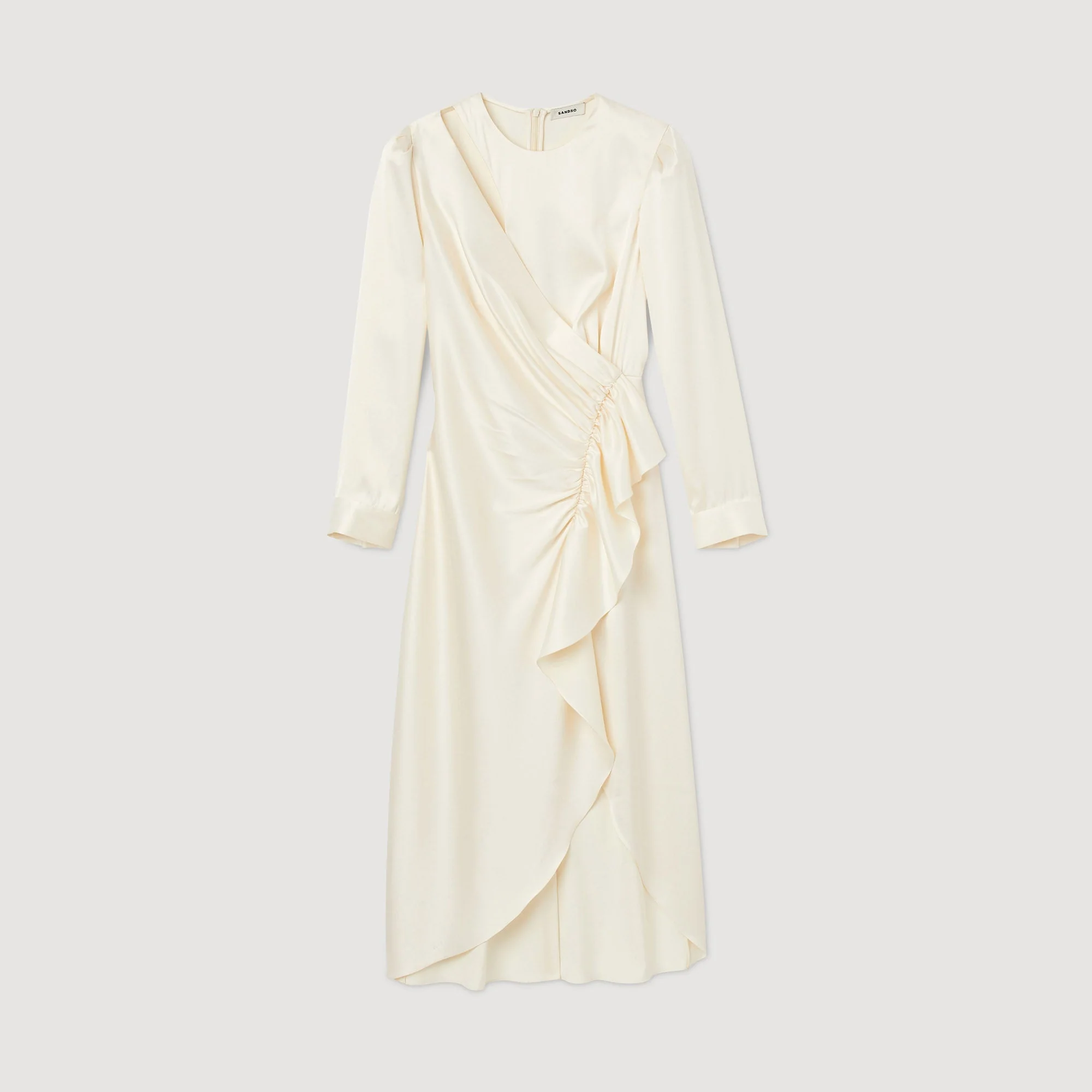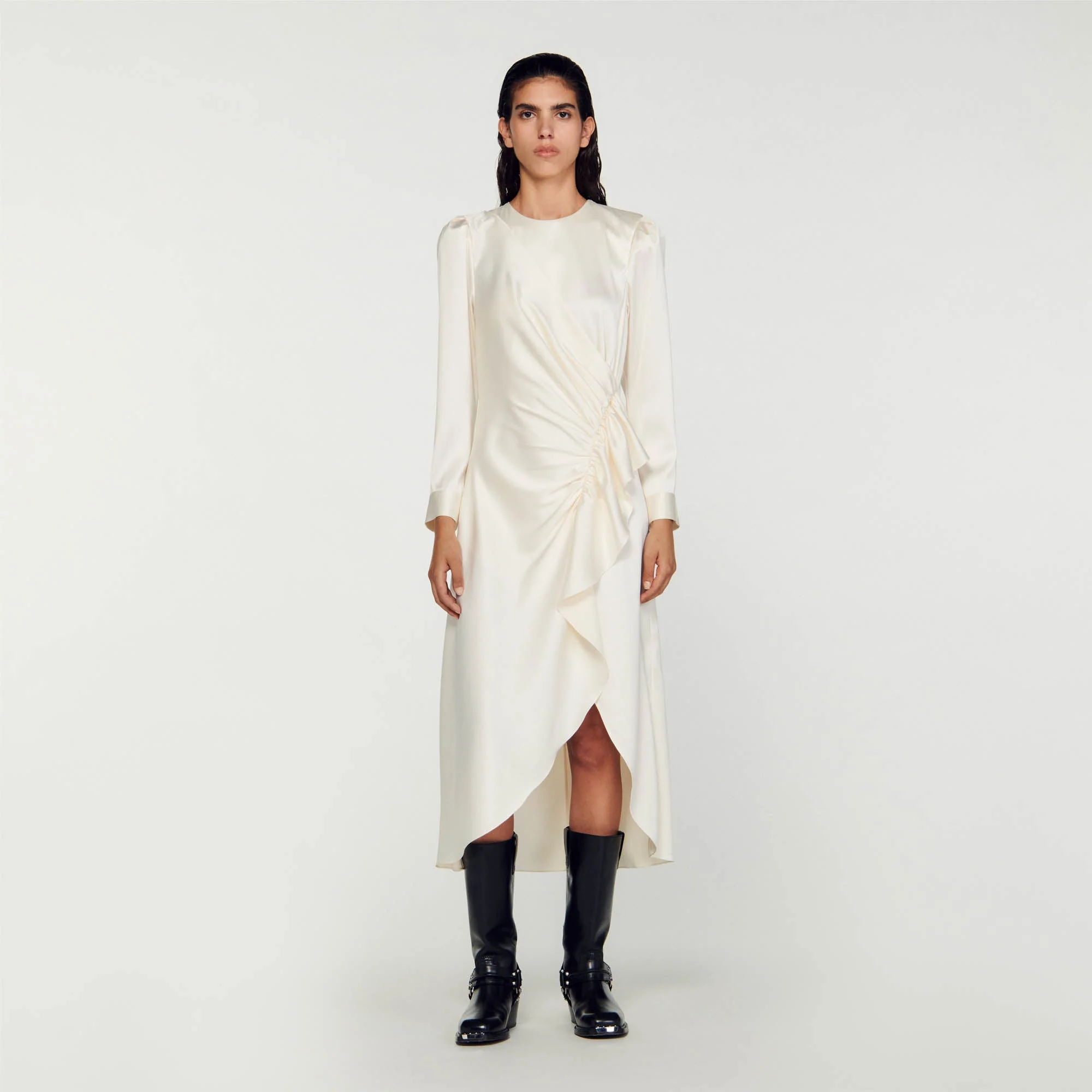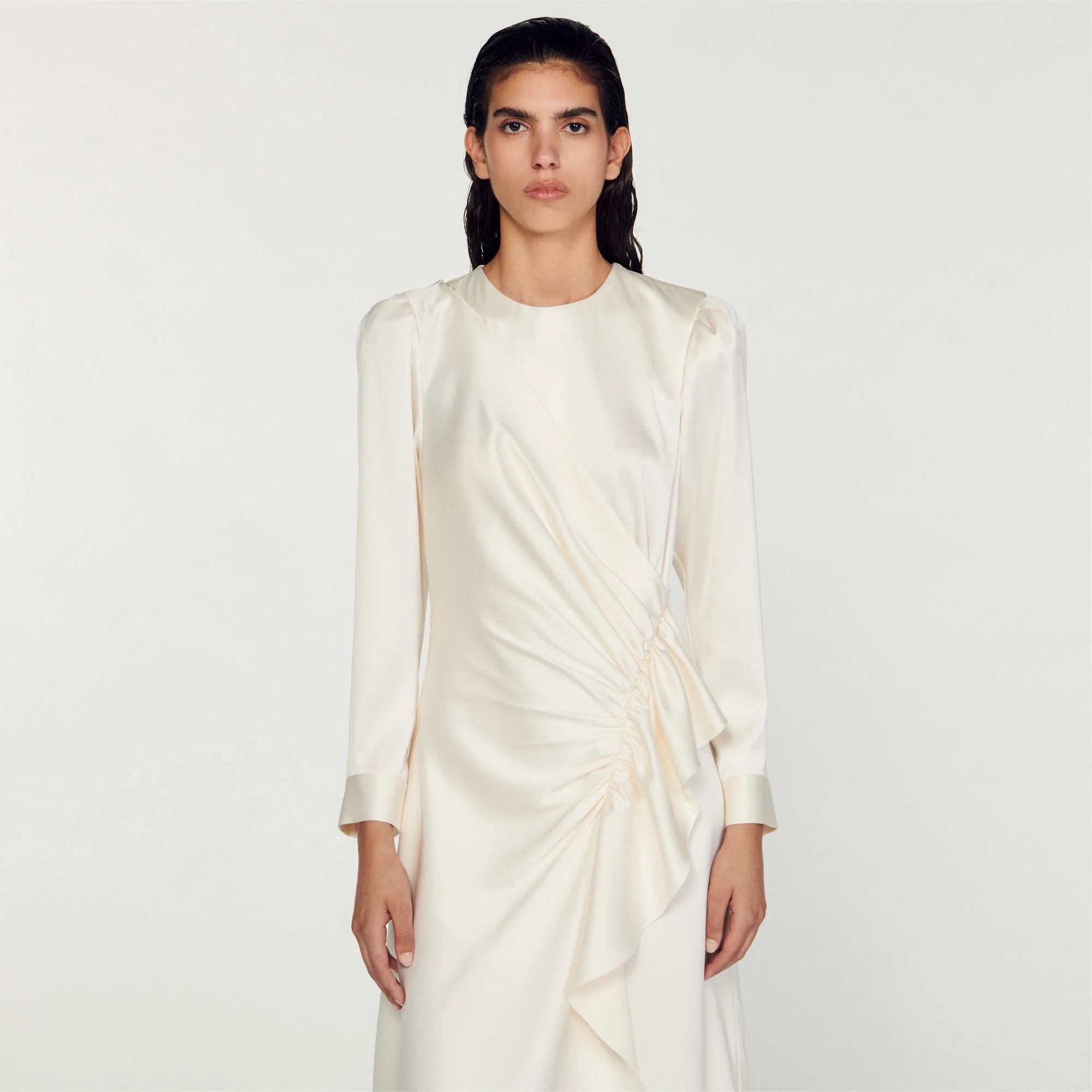 Vestido con efecto superpuesto y satinado con mangas largas, cuello redondo y decorado con fruncidos y un juego de volantes en el lateral.• Vestido midi Sandro mujer