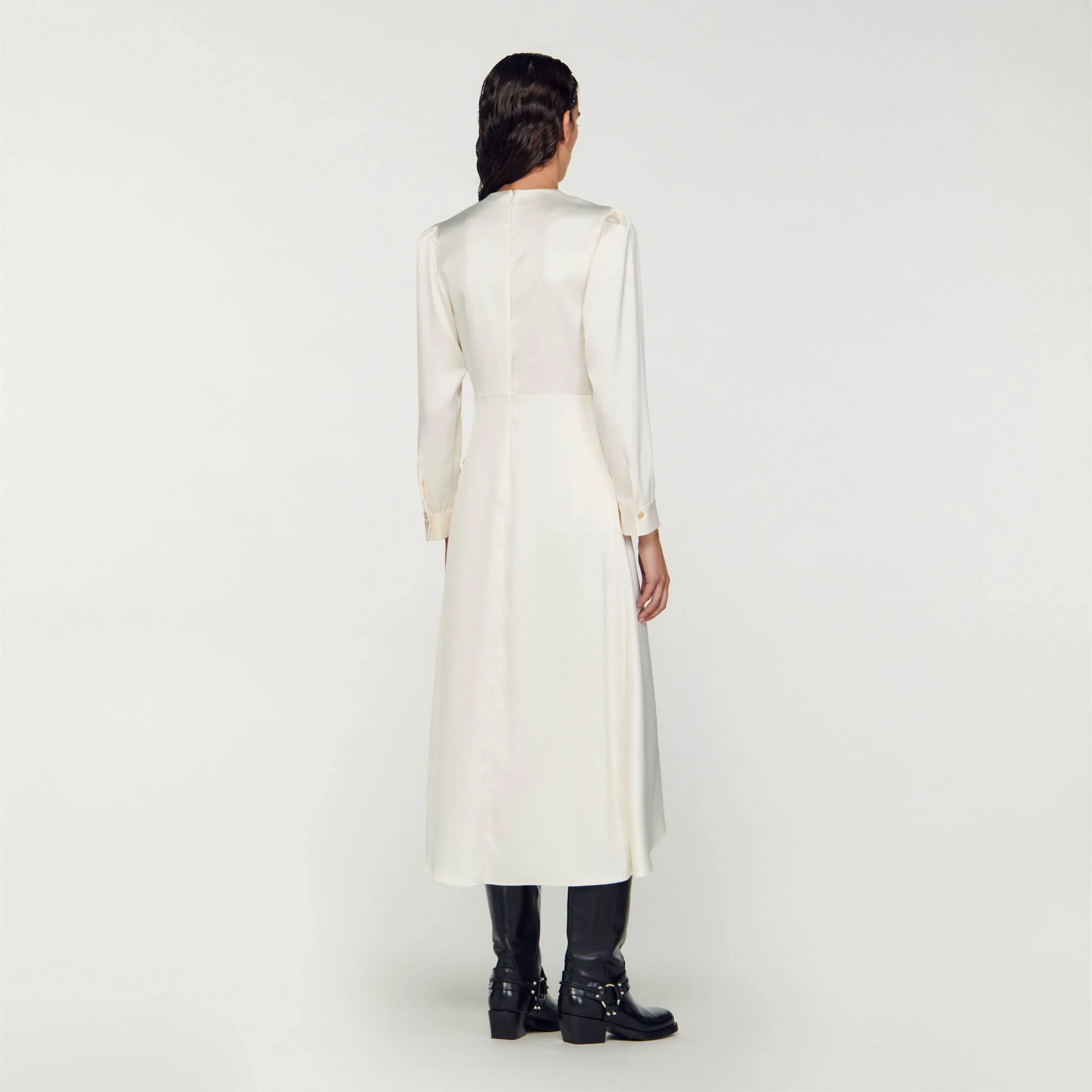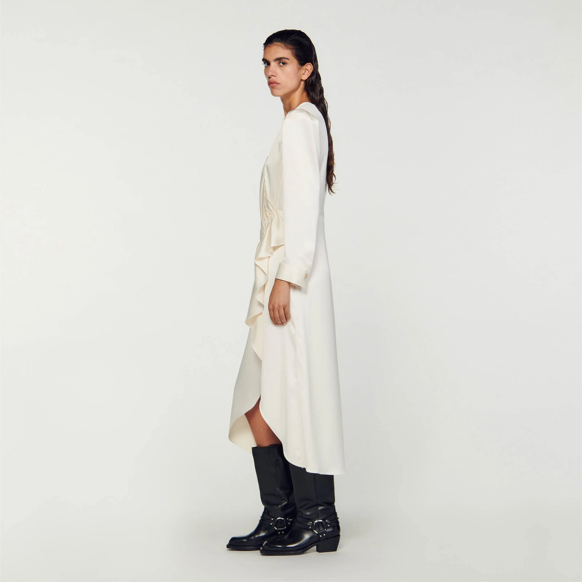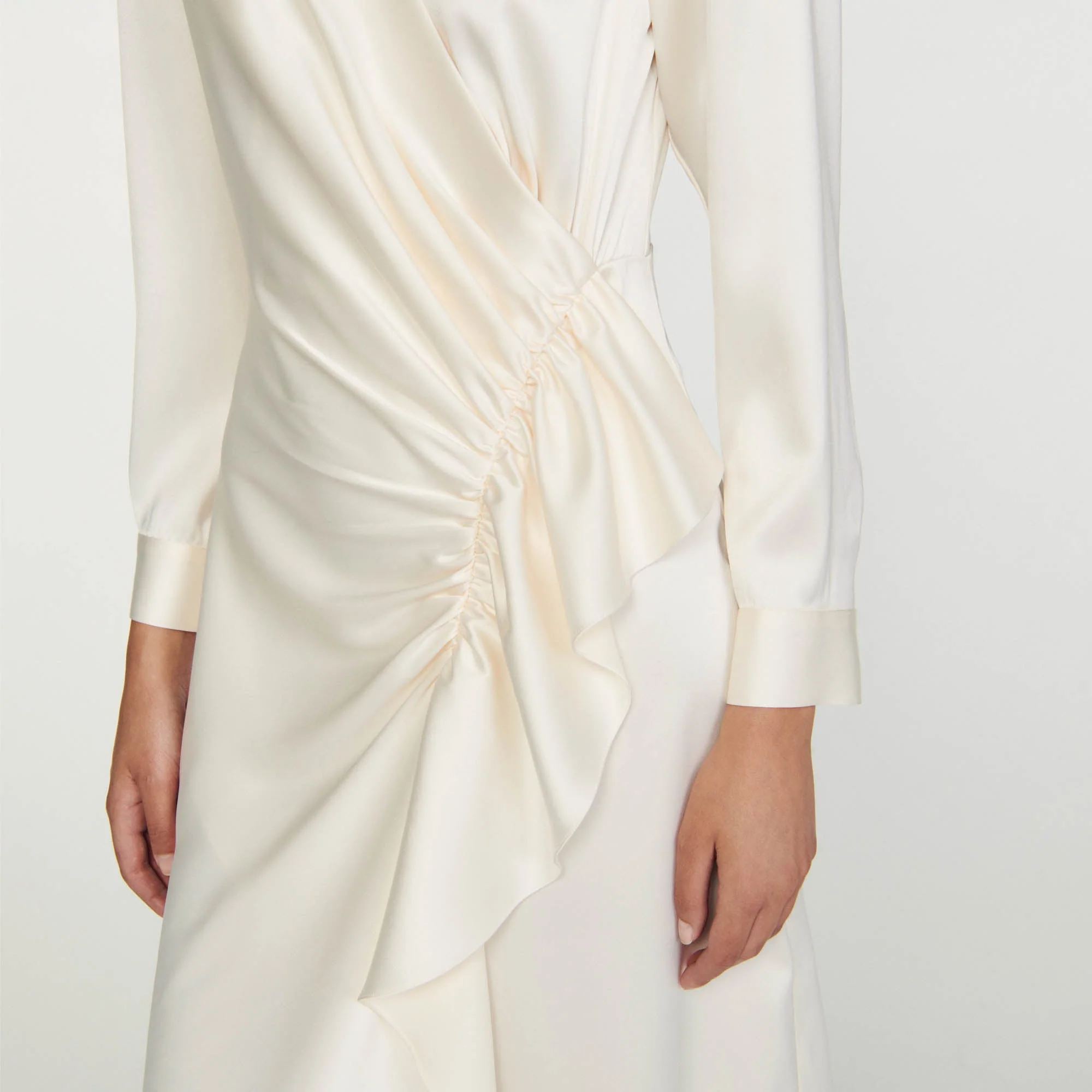 Vestido con efecto superpuesto y satinado con mangas largas, cuello redondo y decorado con fruncidos y un juego de volantes en el lateral.• Vestido midi Sandro mujer