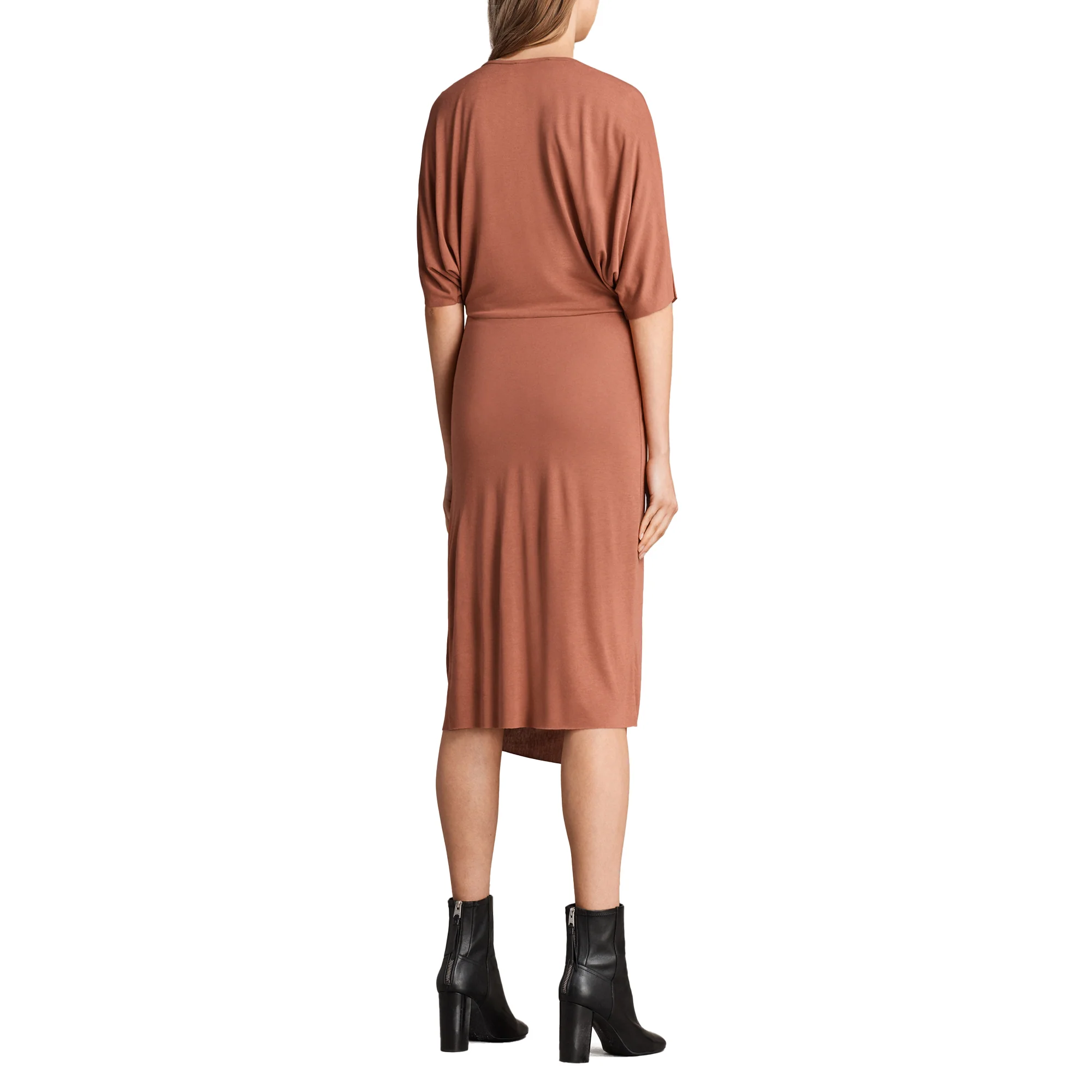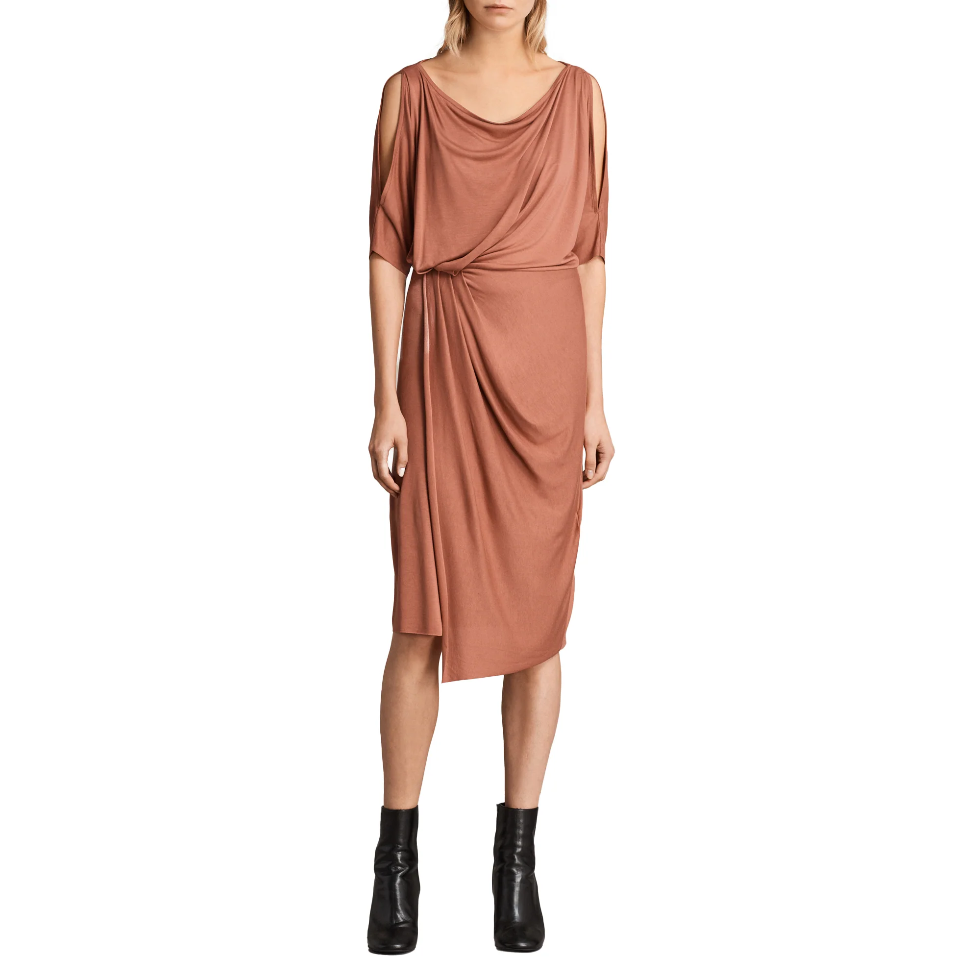 VESTIDO SINA, MARCA ALLSAINTS. VESTIDO LARGO ENVOLVENTE, CUELLO REDONDO, MANGA CORTA CON HOMBROS DESCUBIERTOS, CORTE FLUÍDO. 100% ALGODÓN. LAVADO A MANO AL REVÉS.