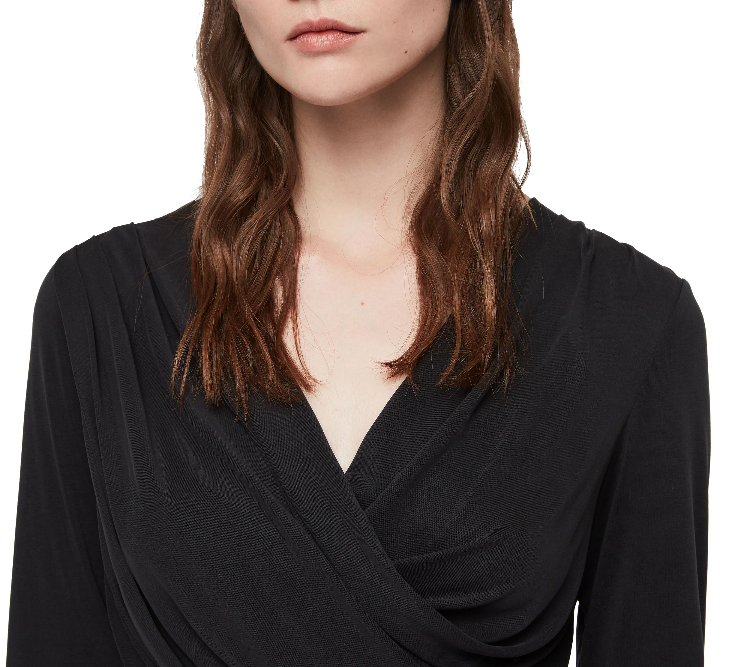 VESTIDO SOFIA LS JERSEY, MARCA ALLSAINTS. VESTIDO CORTO MANGA LARGA, ESCOTE EN V, CRUZADO, DETALLE FRUNCIDO.