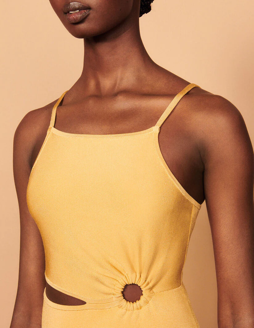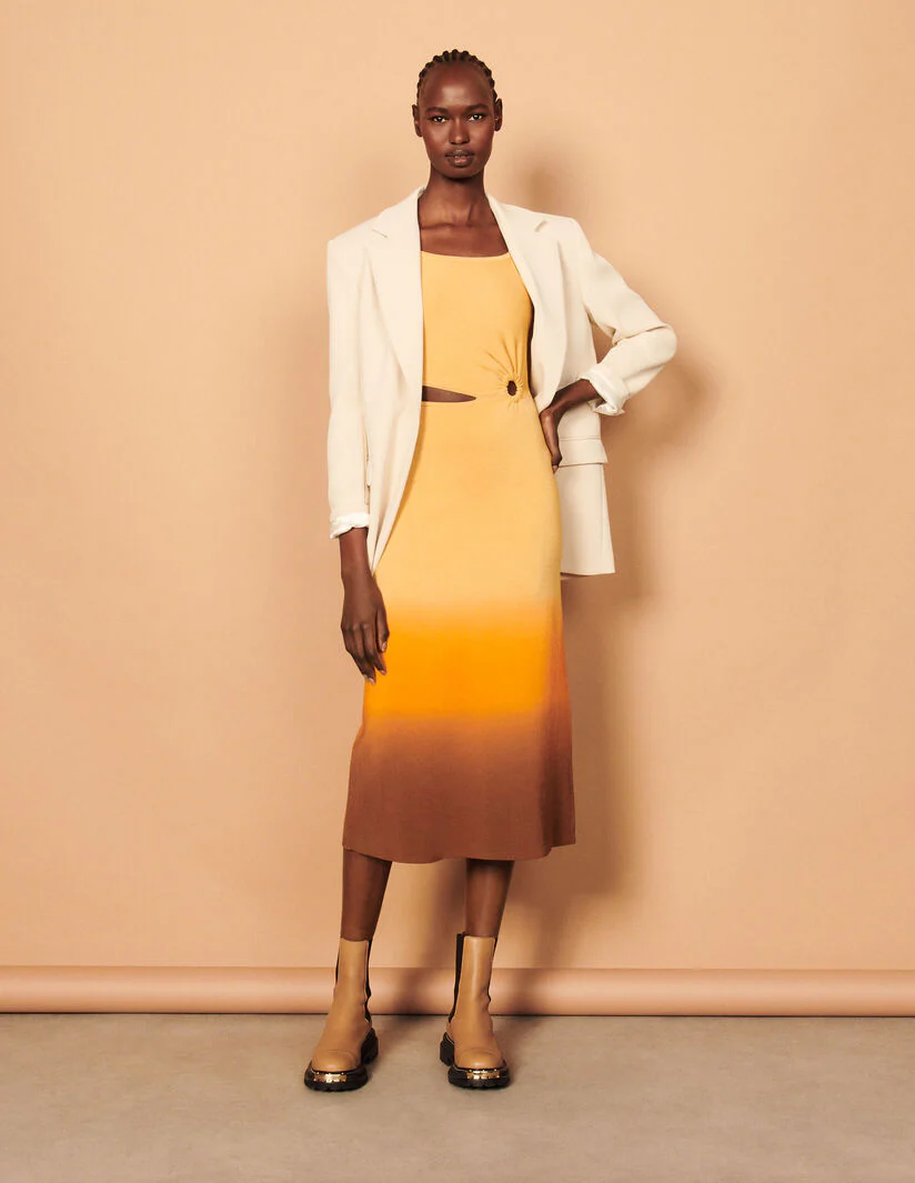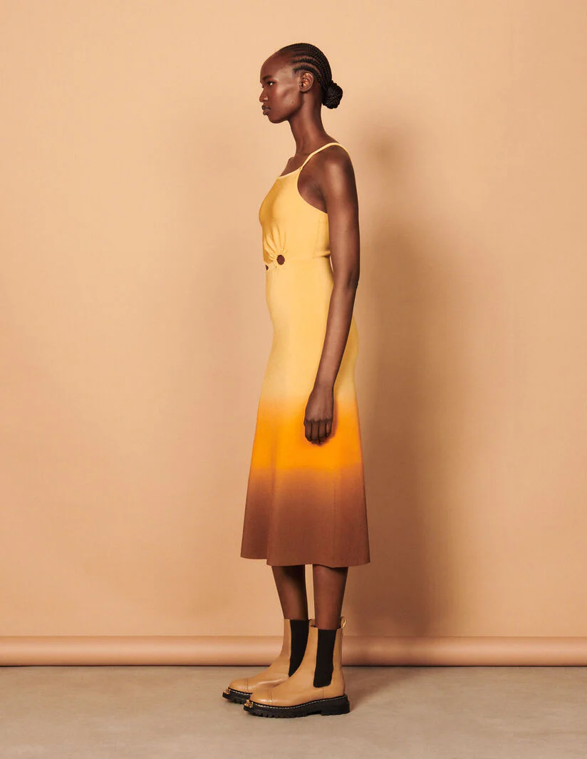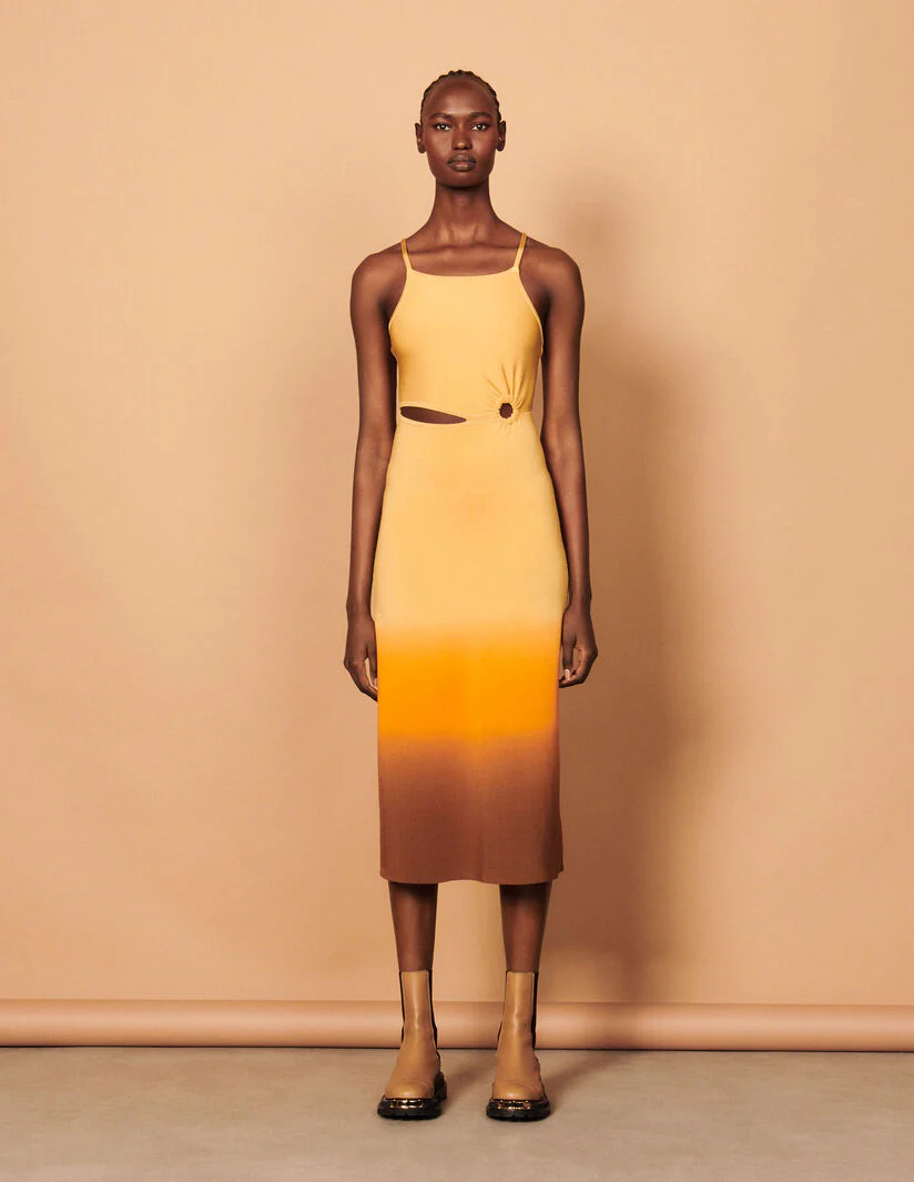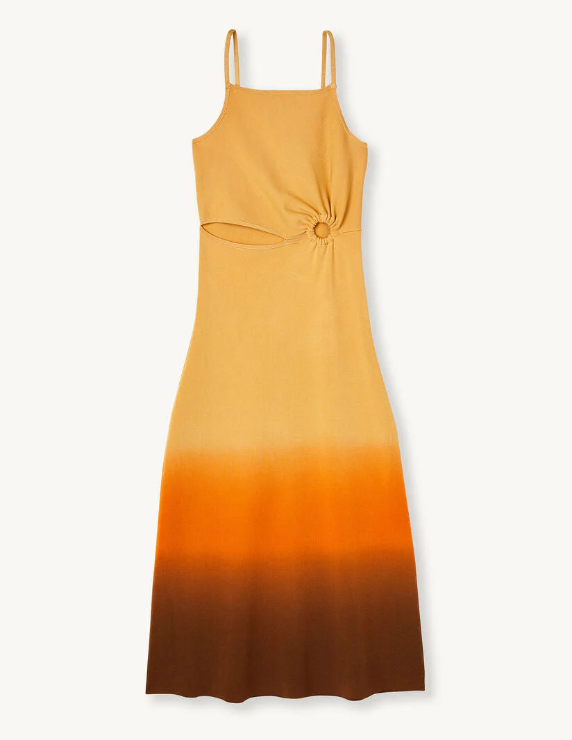 Vestido midi con estampado tie & dye degradado, con finos tirantes y sublimado con aberturas en los laterales.