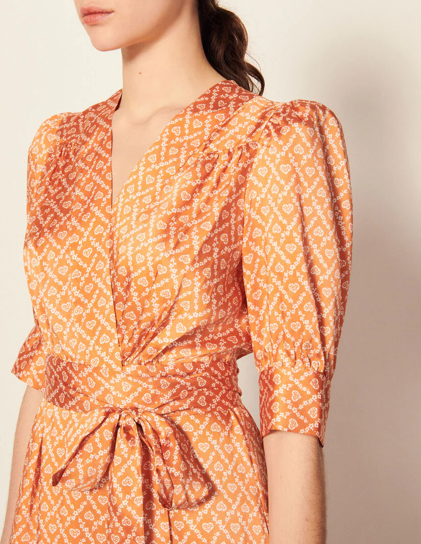 Vestido cruzado fluido y largo sublimado con un estampado de corazones. Presenta un cinturón anudable en la cintura, manga abullonada y parte inferior de la falda con volante.