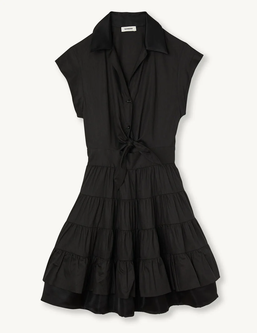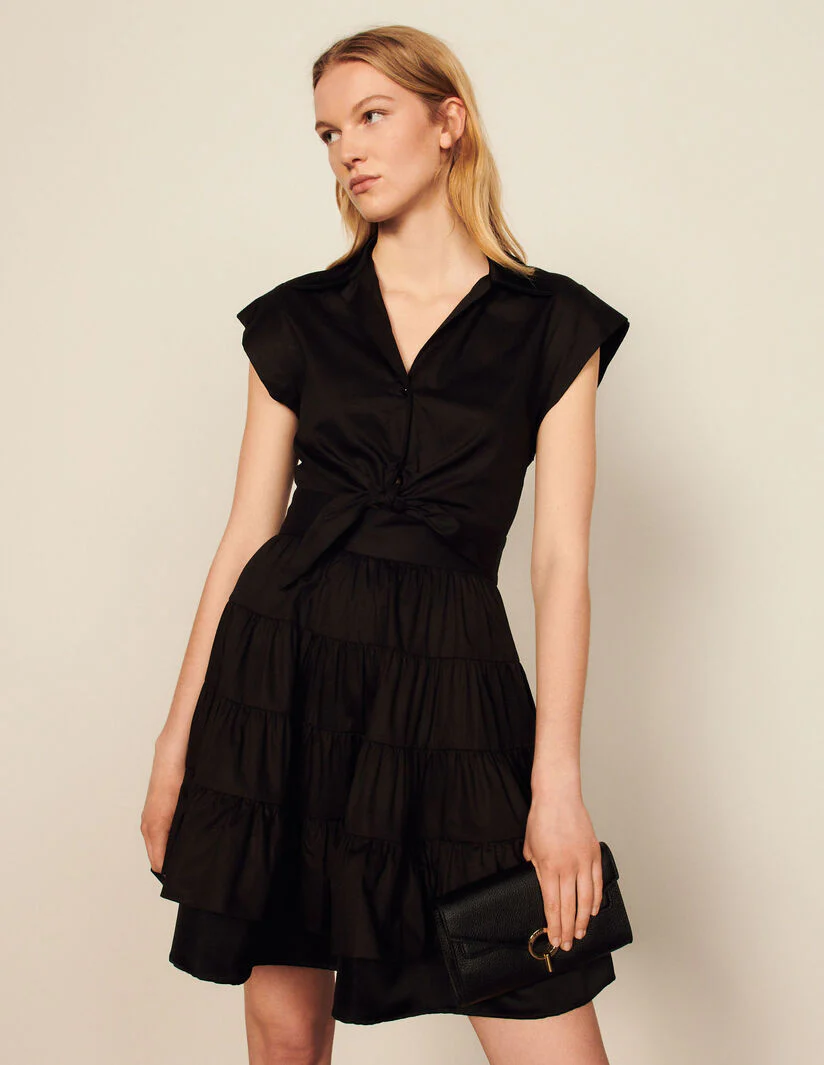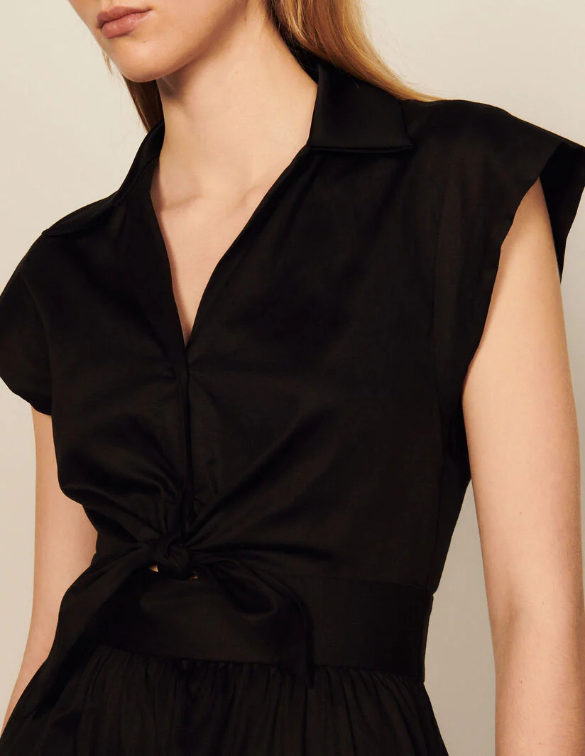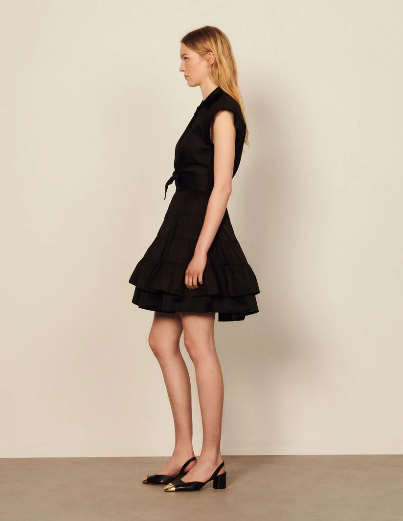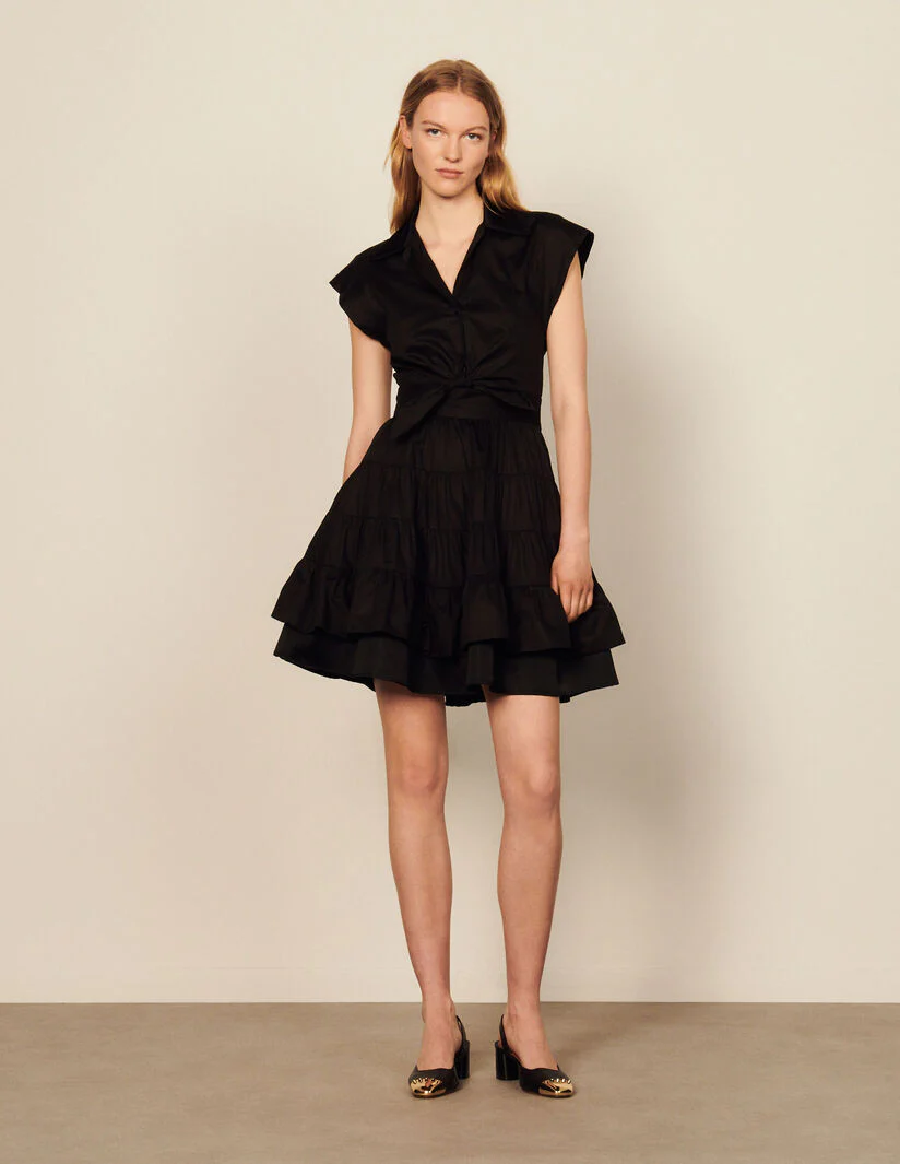 Vestido corto sin mangas, con escote en V calado anudable en la cintura y una voluminosa falda con volantes.