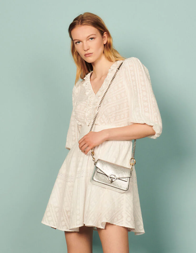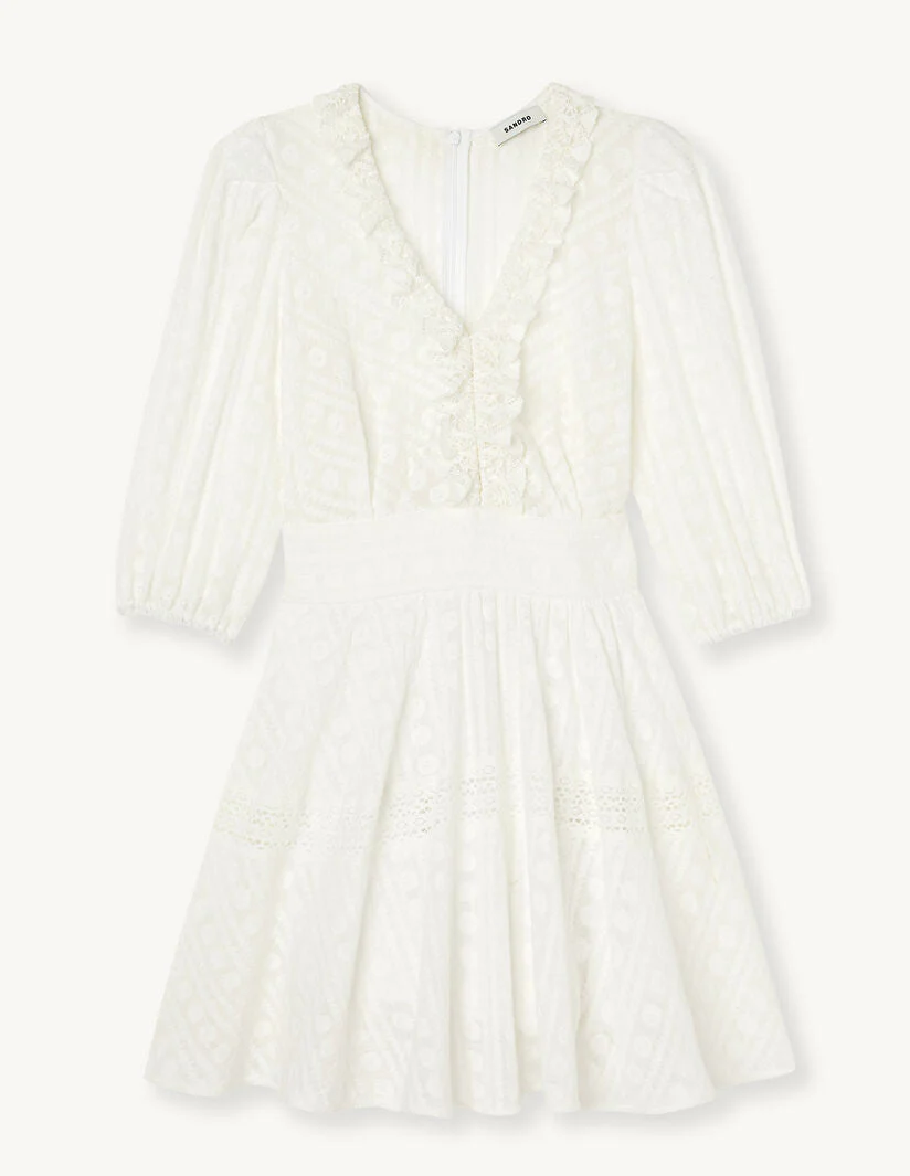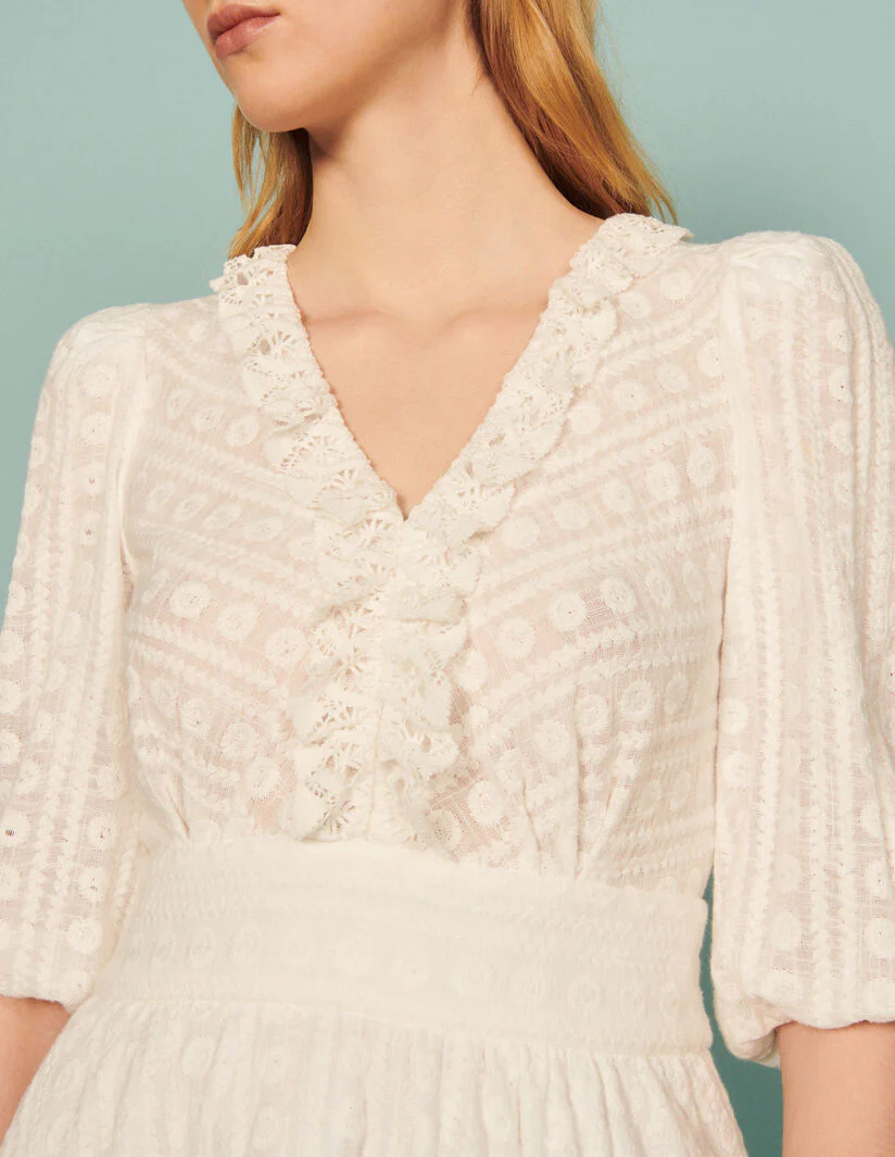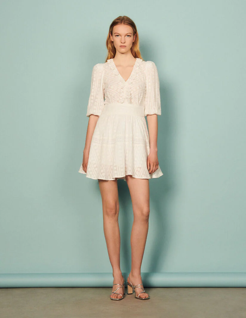 Vestido corto de bordado inglés ajustado a la cintura, con un escote en V sublimado con volantes y manga 3/4.