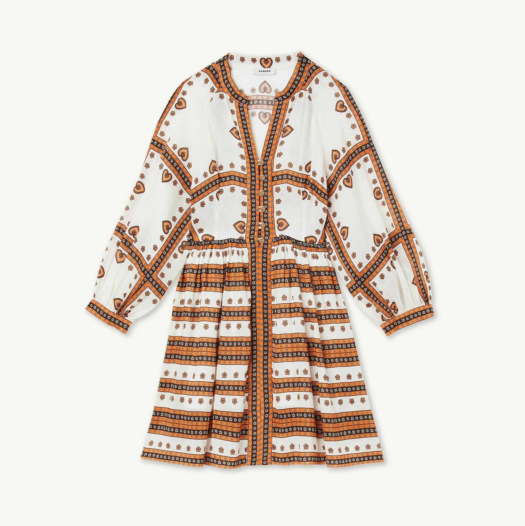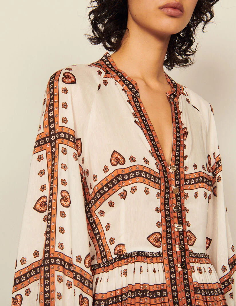 Vestido corto con escote en V sublimado con botones dorados, manga larga voluminosa, falda evasé y estampado Bandana.