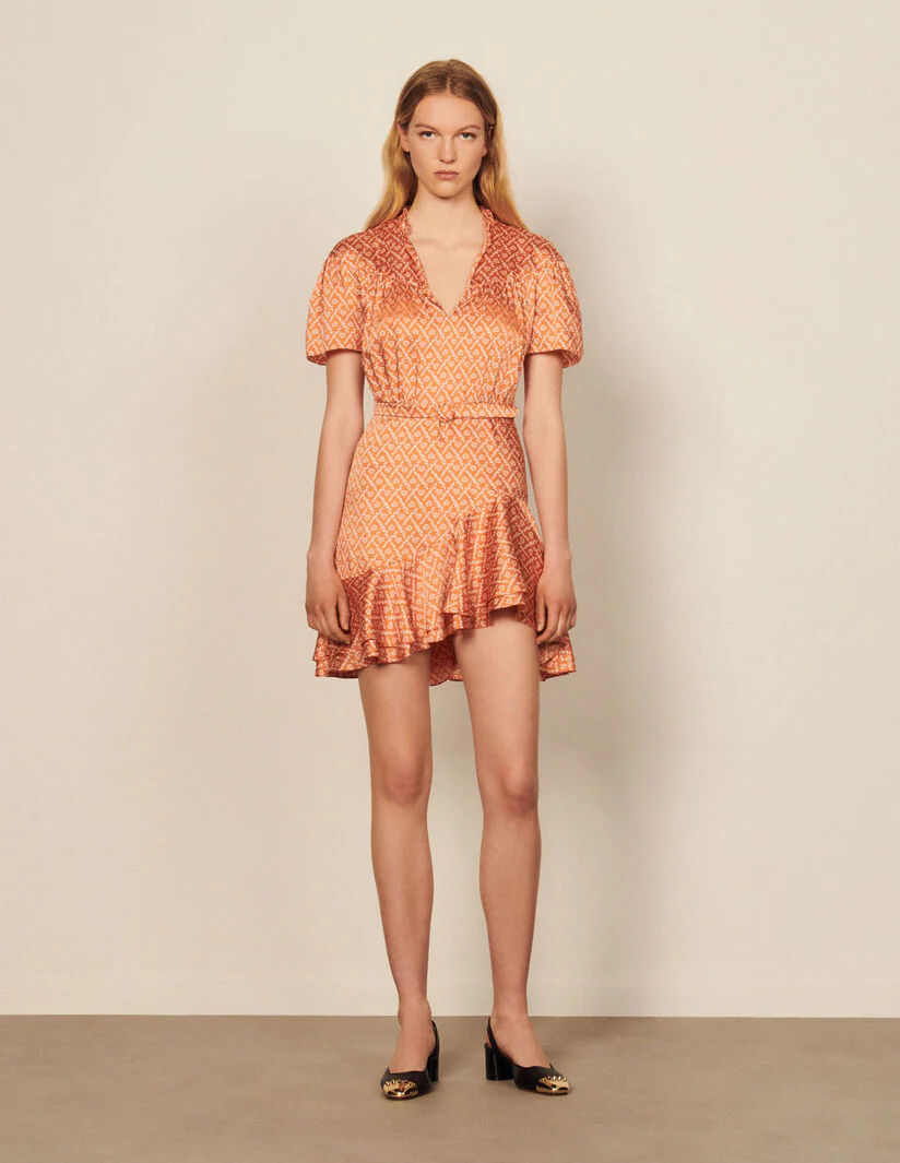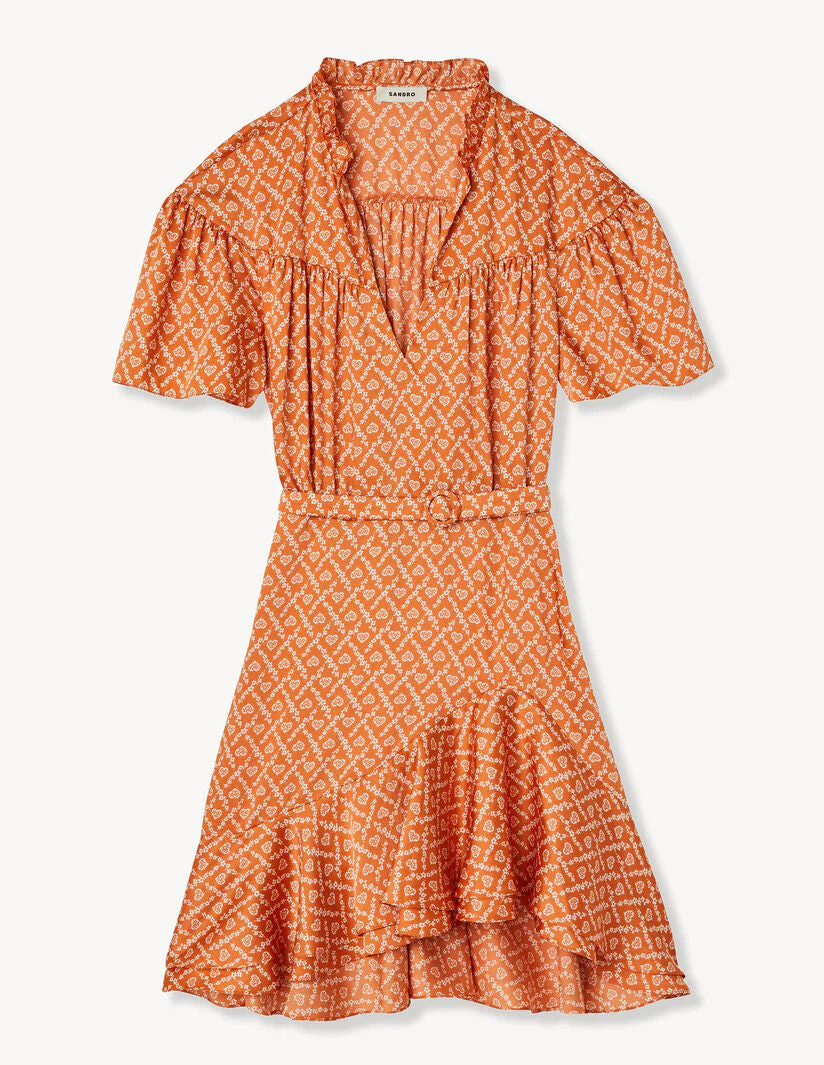 Vestido corto avolantado de manga corta con escote en V y un pequeño cinturón extraíble con hebilla forrada, sublimado con un estampado de corazoncitos.