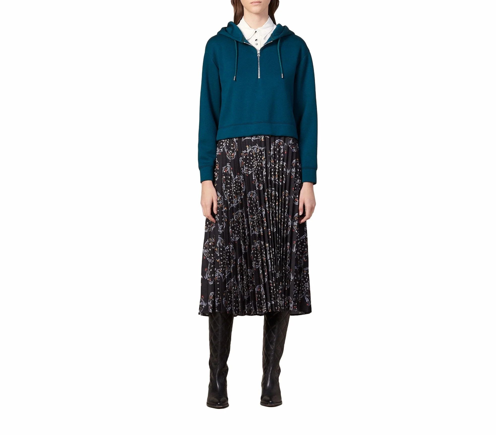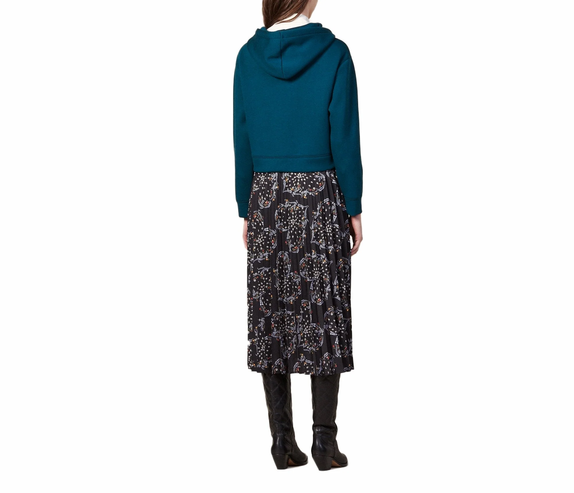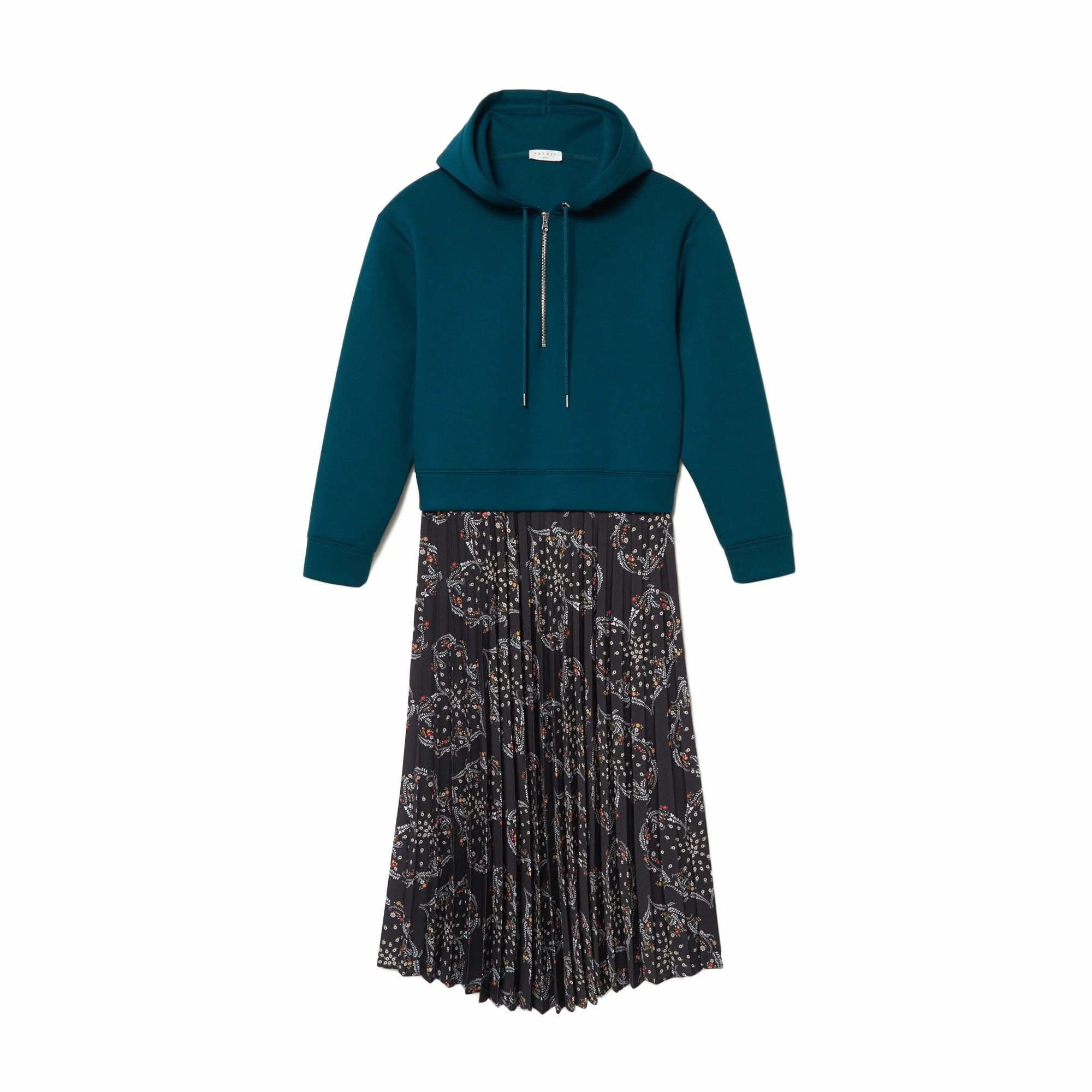 VESTIDO LARGO CON SUDADERA SUPERIOR Y FALDA TABLEADA ESTAMPADA, MARCA SANDRO. COMPOSICIÓN:100% VISCOSA. INSTRUCCIONES DE LAVADO: LIMPIEZA EN SECO PROFESIONAL. REVISAR ETIQUETA INTERNA DE LAVADO PARA MÁS INFORMACIÓN..
