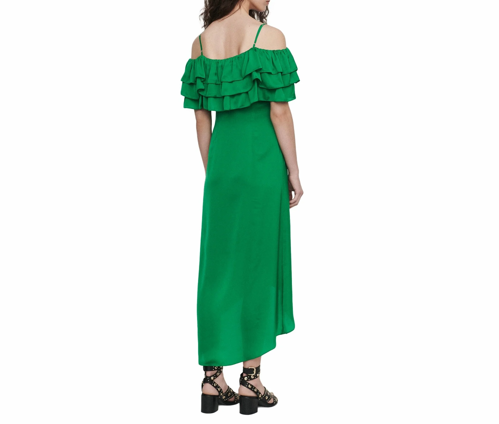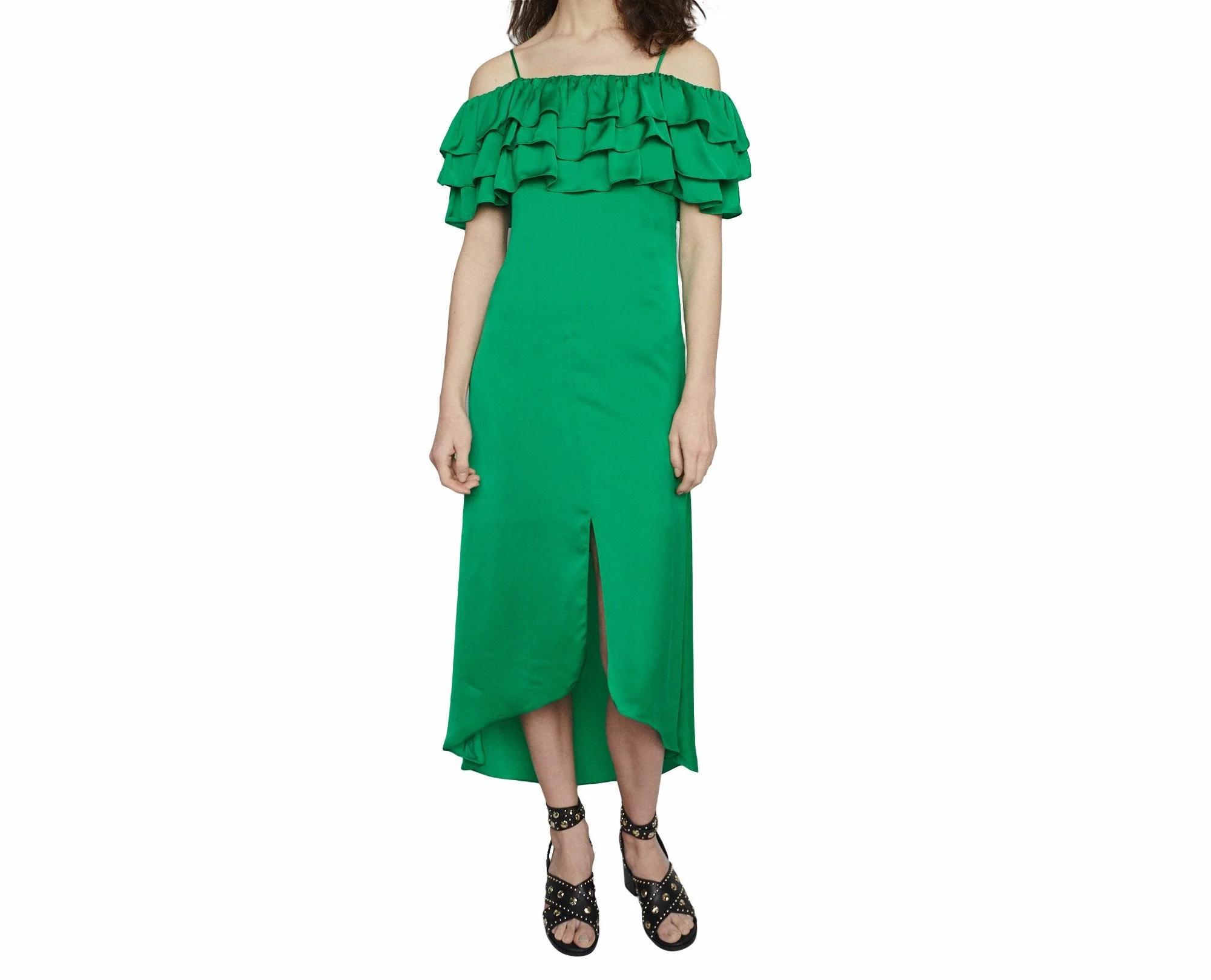 VESTIDO LARGO CIERRE DE CREMALLERA OCULTO EN EL LATERAL CUELLO «BARDOT», ESCOTE CON VOLANTES HOLGADOS, PINZAS EN LA PARTE DELANTERA Y TRASERA, TOTALMENTE FORRADO, BAJO ASIMÉTRICO Y CON VUELO, MARCA MAJE. COMPOSICIÓN: 100% POLIÉSTER, FORRO 100% VISCOSA. INSTRUCCIONES DE LAVADO: CONSULTAR INSTRUCCIONES DE LAVADO EN ETIQUETA INTERNA