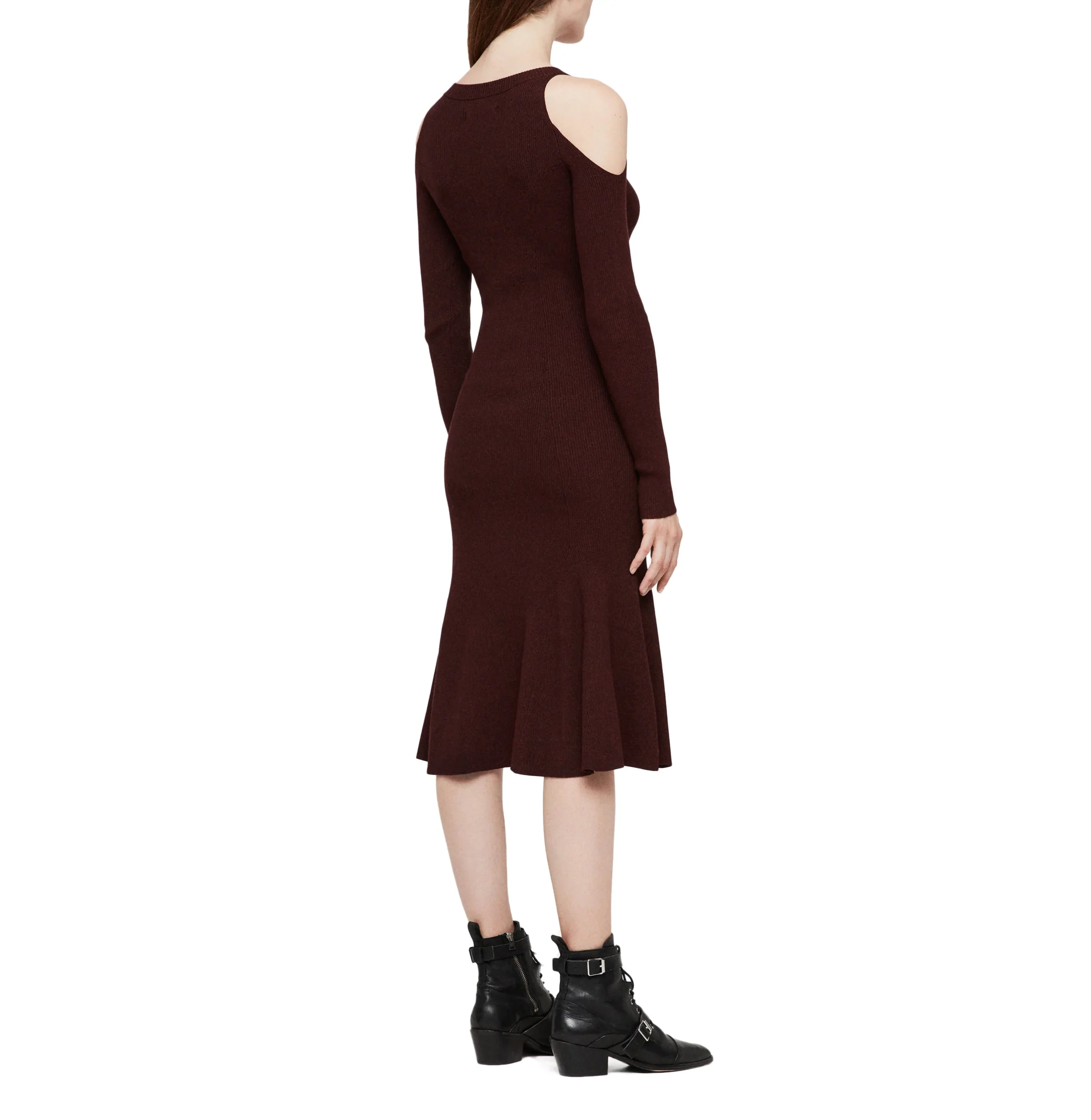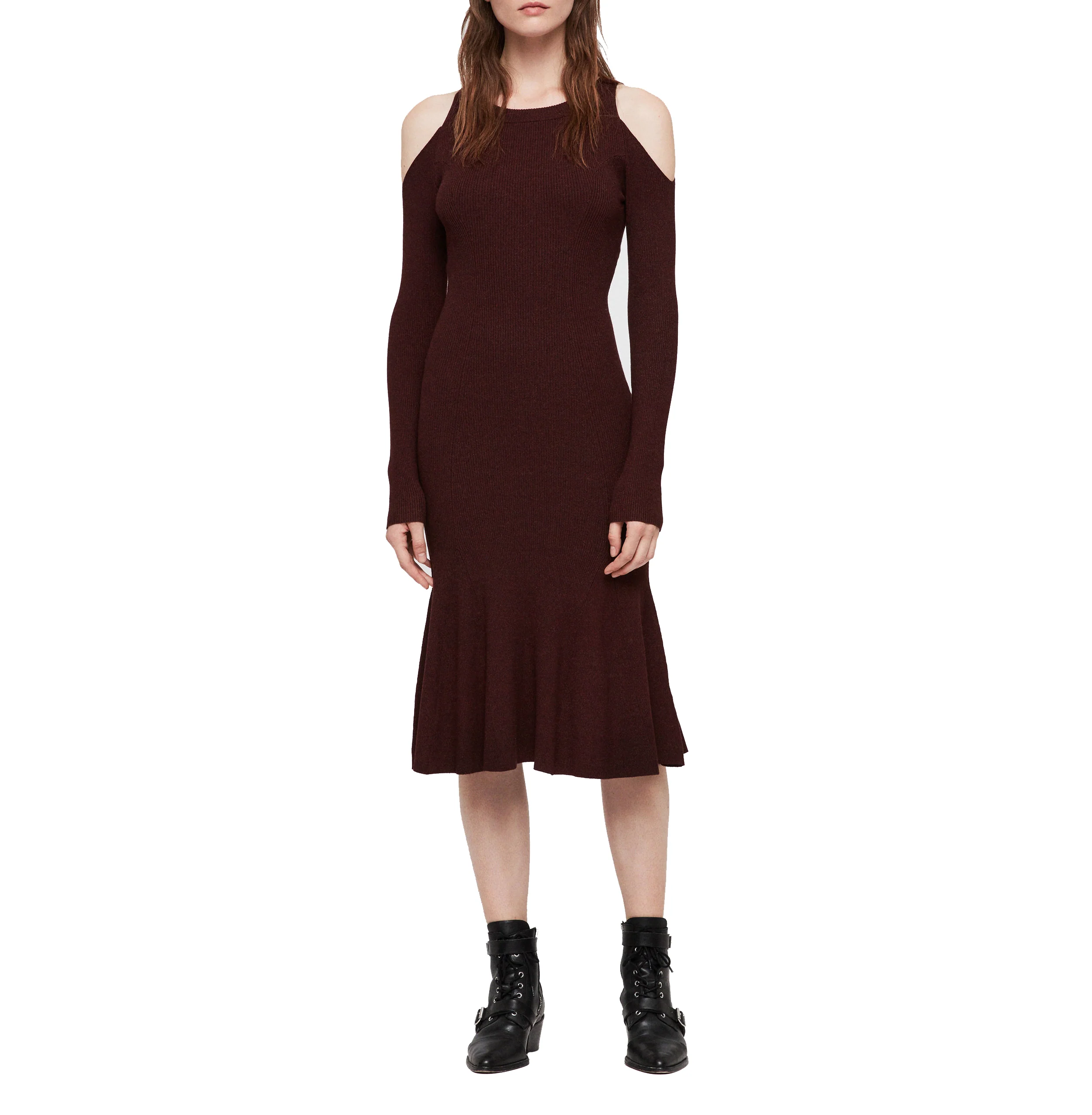 VESTIDO YASMIN, MARCA ALLSAINTS. VESTIDO DE PUNTO ESCOTE REDONDO, HOMBROS DESCUBIERTOS, LARGO MEDIO. 72% VISCOSA, 28% POLIÉSTER. LAVAR A MANO O LIMPIAR EN SECO.